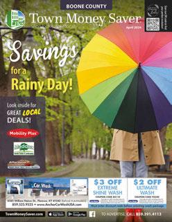 Like us on: 5864 Taylor Drive, Burlington 859-534-5999 Mon-Sat 8am-7pm, Sun 9am-6pm Includes Super Deluxe EXPRESS HAND WAX With TMS coupon only. Not valid with any other offers. Expires 5/15/24. BAILEY’S CAR WASH • 859-534-5999 $5499 $79.99 -$25.00 Coupon BUY 4 WASHES GET 2 FREE *50PCTOFFTMS* With TMS coupon only. Not valid with any other offers. Expires 5/15/24. BAILEY’S CAR WASH • 859-534-5999 Includes: Super Deluxe Full Service Interior/Exterior Wash, Hand Wax, Super Clean • Clean all Hard Plastic Services • Tires Shined • Windows Cleaned • Dress All Hard Plastics w/Leather Vinyl Conditioner • Super Vacuum (All Cracks & Crevices, Under All Seats) 50% OFF MINI DETAIL Express Hand Wax $79.99 Super Clean $79.99 Super Deluxe Car Wash $34.00 Total $193.98 50% OFF You Pay Only $96.99 With TMS coupon only. Not valid with any other offers. BAILEY’S CAR WASH • 859-534-5999 TO USE IN THE NEXT 14 DAYS! Buy 1 Bailey’s Best Car Wash Get 1 Exterior Bailey’s Best Car Wash FREE ($27 Value) FREE BAILEY’S BEST CAR WASH Only $32.95 Oil & Filter Change, Lube Chassis, Top Off All Fluids & Adjust Tire Air Pressure While You Wait. By Appointment Only. Up to 5 qts. Synthetic Blend 5W30. Most Cars & Light Trucks. AUTOMASTERS • 859-384-7979 • Must present coupon at time of service. Expires 5/15/24. $20 OFF Discount Applies To Labor Cost of $100 or More $20 discount applies to repairs of $100 or more. Excluding tax. Discount will be applied to labor only. Not valid with any other offers. Excludes Tires & Batteries. Must present coupon at time of service. Expires 5/15/24. • AUTOMASTERS • 859-384-7979 Synthetic Oil Change $49.95 • Oil & Filter Change • Lube Chassis • Top Off All Fluids • Adjust Tire Air Pressure AUTOMASTERS • 859-384-7979 Must present coupon at time of service. Expires 5/15/24. FREE Spring Brake Inspection! Brake Inspection AUTOMASTERS • 859-384-7979 • Must present coupon at time of service. Expires 5/15/24. FLORENCE Published By Town Money Saver, Inc. Corporate Office • PO Box 356 • Lucas, OH 44843 © 2024 TMS Franchising, Inc. All rights reserved. For advertising information, call Will 859-391-4113 NEXT ISSUE IN HOMES: May 16, 2024 ADVERTISING DEADLINE: May 1, 2024 POSTAL CUSTOMER PRSRT STD ECRWSS U.S. POSTAGE PAID Town Money Saver, Inc. townmoneysaver.com