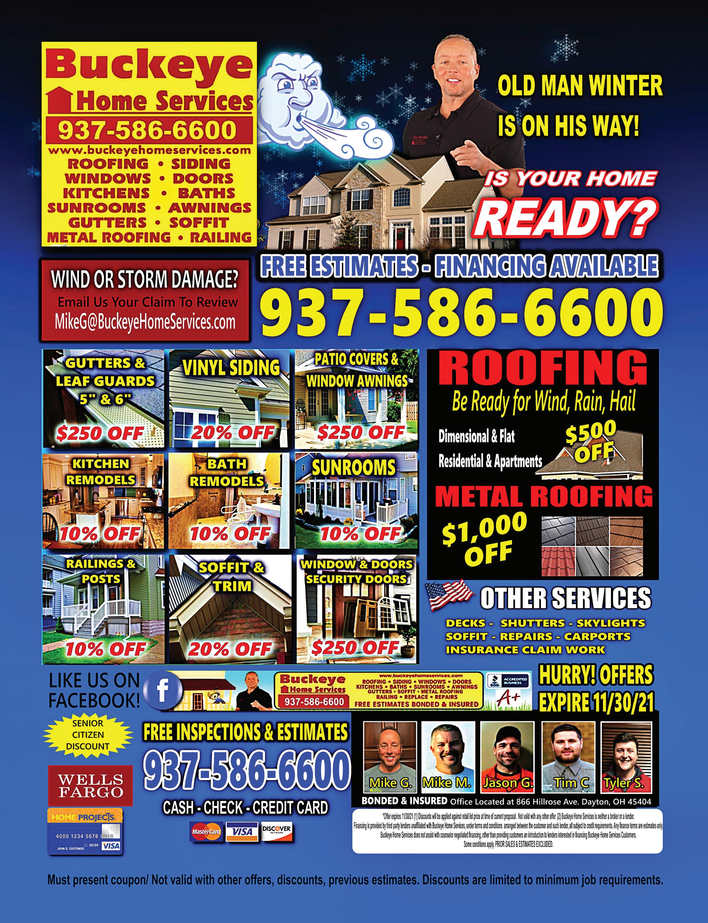 15 Months Same As Cash! Free No Hassle No Obligation Estimate! No Project or Service Too Small! 937-520-6088 Locally Owned & Operated IN TROY OHIO Over 20 Years of Experience ALL INSURANCE CLAIMS ACCEPTED. Locally Owned & Operated in Troy Ohio by MIKE RANDAZZO Room Additions • Leaf-proof Gutters Finished Carpentry (Built-in shelving, crown molding) Decking (wood & composite) • Roo ng Bathrooms & Kitchens • Windows & Doors Siding (vinyl, wood, composite) Finished Basements SCHEDULE YOUR WINTER PROJECT NOW!