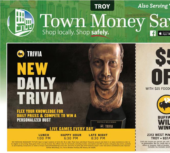TROY November 2021 Also Serving TIPP CITY! TM & ©2021 Buffalo Wild Wings, Inc. BWW2021-0368562 $ 10 OFF (WITH MINIMUM $40 FOOD PURCHASE) 2313 W. MAIN STREET • TROY • 937.440.9016 Not valid on Tuesday’s and Thursday or combined with any other offer. Valid on Dine-In or Call In orders. Limit one coupon per person, per visit. Must present original coupon; no photocopies. Not for resale. Not valid with any other discounts, offers or coupons. Valid at location listed above. No cash value. Excludes tax. Excludes alcohol. Code: 10. Expires 12/31/21. SCAN THE QR CODE AND NOMINATE YOUR FAVORITE MIAMI COUNTY ATHLETE! Athletes chosen will be interviewed on PowerFM Radio Weekly. Buffalo Wild Wings Troy is a proud sponsor of Miami County Sports. BAR FOOD BRING ON THE YOUR HOMETOWN SOFT WASH SPECIALISTS! SERVING TROY, TIPP & SURROUNDING AREAS! Coming To Your Neighborhood! Book Now! CLIP & SAVE SPECIALIZING IN RESIDENTIAL SOFT WASH TECHNIQUE 1 Story Home Only $34900 Always Includes sidings, gutters, down spouts, soffits, fascia 1 1/2 – 2 Story Home Only $44900 Always Includes sidings, gutters, down spouts, soffits, fascia “We Kill The Green!” FREE ESTIMATES 937 - 710 - 3606 LICENSED • BONDED • INSURED BEFORE AFTER OPERATED BY JEFF KARAS