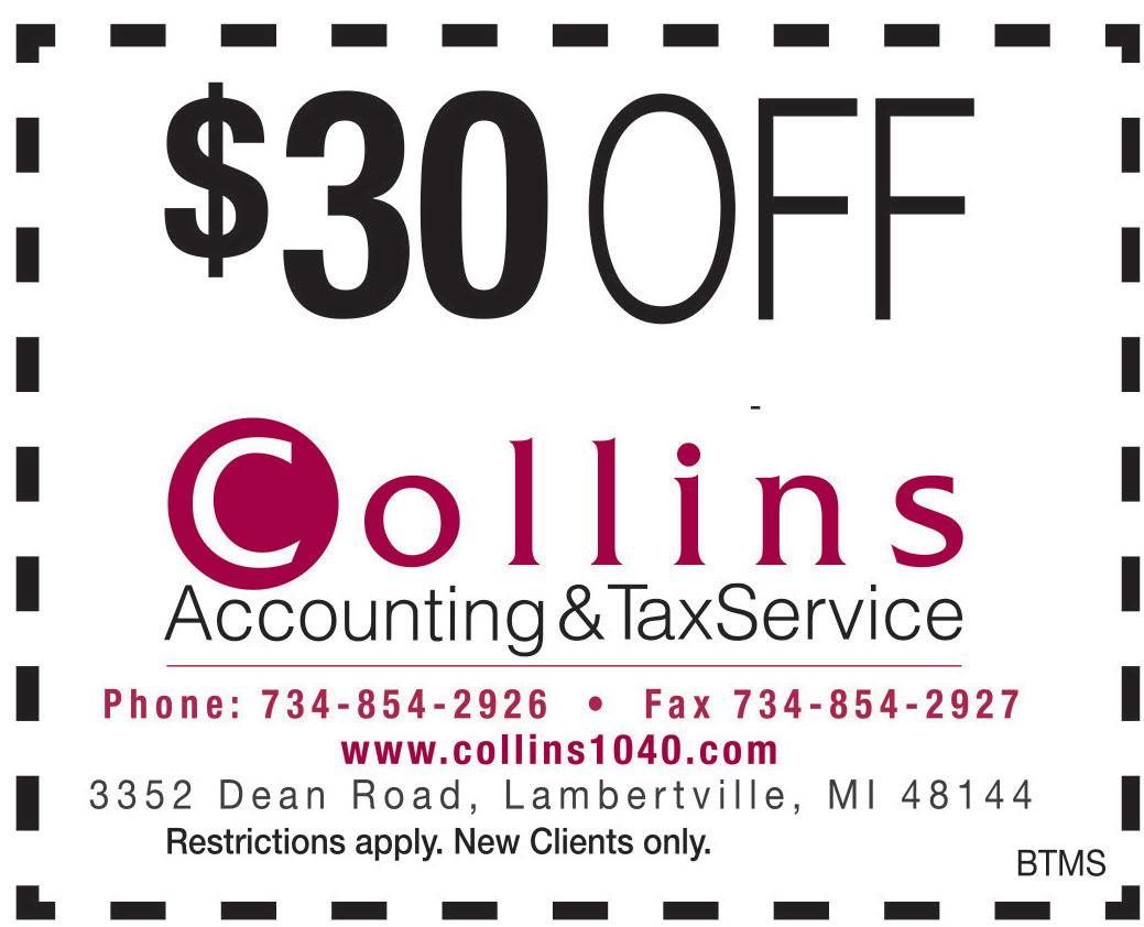 WEST TOLEDO Published By Town Money Saver, Inc. Corporate Office • PO Box 356 • Lucas, OH 44843 © 2016 TMS Franchising. All rights reserved. For advertising information, call Kevin 419-467-5593 NEXT ISSUE IN HOMES: FEB. 1-3 ADVERTISING DEADLINE: JANUARY 18 PRSRT STD ECRWSS U.S. POSTAGE PAID Town Money Saver, Inc. townmoneysaver.com CELEBRATING 26 YEARS IN BUSINESS! 2022 Income Tax Preparation EXPIRES 4/18/23 16TH ANNUAL MILITARY APPRECIATION DRIVE Income Tax Preparation MAKE TAX TIME LESS TAXING • FREE Initial Tax Prep Consulation • CPA and Enrolled Agent on Staff • 10% Senior Discount • FREE Tax Prep for any Client’s Dependent* * FREE Income Tax Preparation for any: Active Duty Troop, Reservist, National Guard or Coast Guard* * Processing Fee may apply • Individuals • Corporations • Partnerships • Estates We Dig for Every Deduction Now Offering Phone & Virtual Appointments! Curbside Drop-off and Pick-up Online Signature and Payment Options Call our office for information on your social distancing options 1-877-587-1656 Happy Hour M-Th 2p-5p $5 Margarita (12 oz) 1/2 OFF Nachos beef or chicken $1999 Margarita Pitchers Ladies Night All Day Thurs beef or chicken w/ lettuce & cheese Our New Location Is Now Open! 2500 W. Sylvania TOL 419-472-0700 ORDER ONLINE: LaFiestarestaurante.com Carry-out menu • Reservations accepted Stop in & see our DAILY SPECIALS FORMERLY El Camino Real Try all of our different Margarita flavors Hours (Toledo location) Mon - Thurs 11-9:30 Fri & Sat 11- 10 • Sun 11-9 Visit Our Maumee location: 1406 Reynolds Rd. • 419-897-9222 LUNCH SPECIAL . With coupon. One coupon per table. Dine In Only. Not valid with other specials or offers. Alcohol not included. Exp. 1/31/23 Valid at Toledo loctation only $5 OFF Your purchase of $30 or more Valid at both locations Maumee & Toledo VALID Sun - Thur $3 OFF Purchase of two lunches Mon - Fri until 3pm Taco Tues $2 Tacos . With coupon. One coupon per table. Dine In Only. Not valid with other specials or offers. Alcohol not included. Exp. 1/31/23 Try our new Menu items!