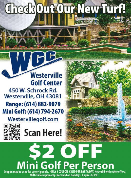Hours: Mon-Fri 10am-5pm Sat 10am-3pm; Closed Sun 20 S. State St, Westerville, OH 43081 614-395-3931 Hours: Sun Closed, Mon-Thu 12pm-8pm, Fri & Sat 12pm-9pm • Cakes & Tortes • Chocolate Dipped Treats • Authentic Italian Gelato • Gluten-Friendly Cakes & Treats Summer Tastes Better With Gelato! • Artisan Chocolates 21 N. State Street Westerville, OH 43081 614-891-6050 • Home Decor • Handcrafted Items • Painted Furniture • Jewelry & Clothing Abbey Rose Bouti e 30% Off Spring & Summer Florals Must present coupon at time of purchase. 1 coupon per customer. ot valid with any other offer or discount. Expires 8/3/23. Hours: Wed-Fri 11am-4pm Sat 11am-5pm 18 N. State Street Westerville, OH 43081 614-259-3515 www.purerootsboutique.com • Boutique & Gallery • Local Artists • Rustic & Re-purposed Items • Locally Grown Products