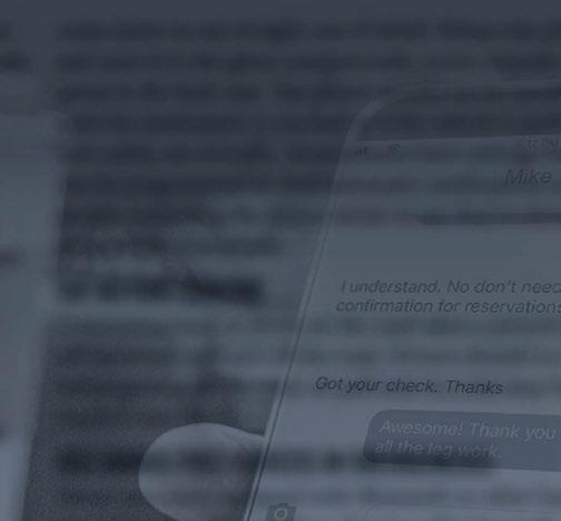 come down to out of sight, out of mind. Silence the phone and store it in the glove compartment, center console or a purse in the back seat. e phone should not be handled until the destination is reached or if the vehicle is pulled over safely out of tra c. Smartphones have settings that can be programmed to send automatic noti cations to people contacting the phone owner to say they’re driving or temporarily unavailable.