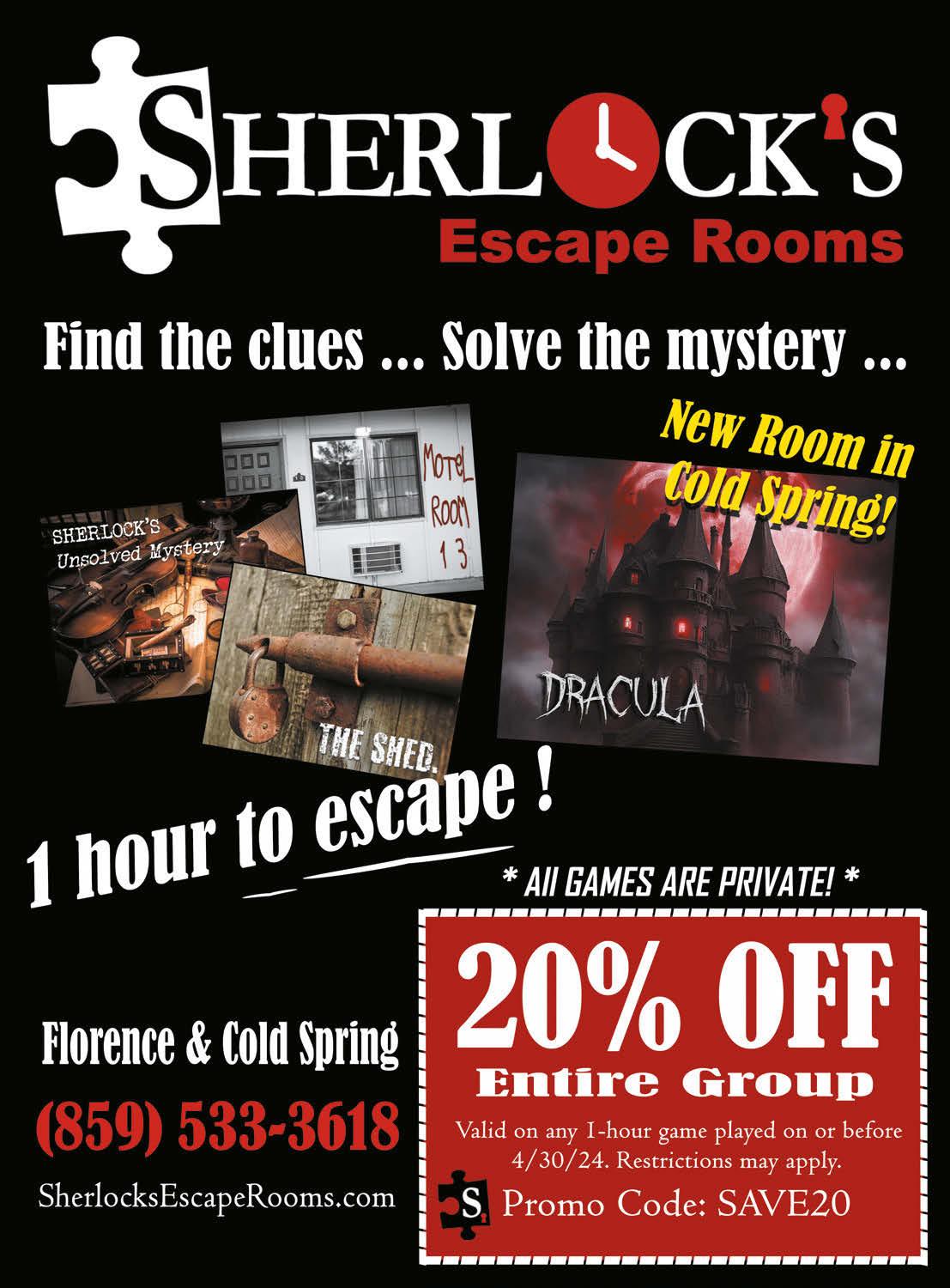 859-635-5263 VISIT US ON FACEBOOK FOR HOURS & UPDATES ANY IN STORE PURCHASE *IN STOCK ITEMS ONLY* PER SCOOP OF ANY BULK PRODUCT *WITH COUPON* expires 3/31/24 expires 3/31/24 MULCH • TOPSOIL • GRAVEL STRAW • PLANTS FLOWERS • YARD SUPPLIES 10% OFF $2 OFF 1400 Gloria Terrell Drive in Wilder (859) 442-7225 www.furnituresolutionsinc.net 3/4 mile south of Town & Country Visit our Facebook page to see more inventory and Great Deals! Furniture Solutions Wilder SALE ENDS MAR. 31, 2024 • Over 20 Years in Business • Assembly Offered • Delivery and Set Up In Your Home Available Up to 50% on Overstock Items - Hot Buys - Closeouts Featuring Sectionals, Sofas, Recliners, Bedroom, Dining Room, Home Office, TV Stands/Credenzas, Mattresses, Luxury Vinyl Flooring & Carpet Furniture Solutions in Wilder • Items for all budgets-Multi Piece Discounts • Everyday Low Pricing on all Items • No Commission Sales = No Pressure • $99.00 for In-Home Delivery & Setup • Over 23 Years in the same location Less than 1-Mile off 275-Wilder AA Highway Exit March Madness Sale All Month! Happy Spring! For advertising information, call Kelsey 419-343-1734