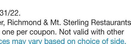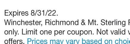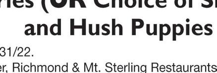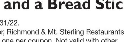 AugustSpecial Minimum of 25 sq ft 15% OFF TILE! We No w C a r ry T il e ! (859) 575-1558 635.5 Big Hill Ave., Richmond, KY 40475 “Rock & Roll” with Madison County’s ONLY fabrication shop for Granite, Marble, Quar tz, and Dekton Counter tops! $1999 CLASS A ON SALE NOW! Up to 50 sq. ft. only LIFETIME SEALER on any natural stone job of 50 square feet or more *August only FREE 1st South 610 Big Hill Avenue #5, Richmond, KY 40475 (across from Sonic & Advance Auto Parts, next door to Snappy Tomato) 859-625-1300 Locally Owned & Operated • Notary Services Available Easy online applicationwww.FirstSouthCreditMadison.com LAST MINUTE VACATIONS COLLEGE EXPENSES BACKTOSCHOOL SHOPPING CAR REPAIRS UNEXPECTED EXPENSES I WANT YOU TO HAVE THE FREEDOM TO BUY WHAT YOU WANT ✓ Perfect Credit Not Needed ✓ Previous Bankruptcy or Divorce Not A Problem ✓ Loans As Small As $300* * All loans subject to credit approval ✓ Same Day Loans - approvals within an hour “We care about you, not your credit score!” 1007 Sylvia Dr. Across from Lake Reba NOW HIRING The ellipse-shaped logo and all other DQ® trademarks are owned by Am. D.Q. Corp. Mpls, MN. © 2022. New Blizzard® TREAT Caramel Fudge Cheesecake Cheesecake pieces and salty caramel pieces covered in fudge