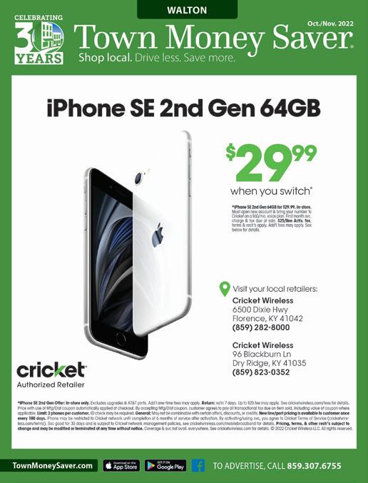 Oct./Nov. 2022 Shop local. Drive less. Save more. WALTON TownMoneySaver.com TO ADVERTISE, CALL 859.307.6755 iPhone SE 2nd Gen 64GB hone 64G $2999