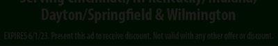 SPRINGBORO Published By Town Money Saver, Inc. Corporate Office • PO Box 356 • Lucas, OH 44843 © 2018 TMS Franchising, Inc. All rights reserved. For advertising information, call Butch 937-286-9976 NEXT ISSUE IN HOMES: June 5, 2023 ADVERTISING DEADLINE: May 15, 2023 POSTAL CUSTOMER PRSRT STD ECRWSS U.S. POSTAGE PAID Town Money Saver, Inc. townmoneysaver.com TRAMPOLINES FOAM PITS NINJA COURSE DODGE BALL TODDLER AREA PARTY ROOMS GET OUT. GET ACTIVE. GET AIR. $50 OFF YOUR NEXT PARTY WHEN YOU BOOK A PARTY WITH 10 OR MORE JUMPERS With coupon. Not valid with other o ers. Not valid on holidays and school holidays. Limited to ONE per household. One time use. Valid for one party only, please. Expires 5/31/2023 $5 OFF 2 HOUR JUMP PASS (LIMIT 4 GUESTS PER COUPON) With coupon. Not valid with other o ers. Not valid on holidays and school holidays. Limited to ONE per household. One time use. Valid for one person only, please. Expires 5/31/2023 FREE HOUR BUY 1 HOUR, GET 2ND HOUR FREE (SAME PERSON/SAME DAY) With coupon. Not valid with other o ers. Not valid on holidays and school holidays. Limited to ONE per household. One time use. Valid for one person only, please. Expires 5/31/2023 FREE HOUR BUY 1 HOUR, GET 2ND HOUR FREE (SAME PERSON/SAME DAY) With coupon. Not valid with other o ers. Not valid on holidays and school holidays. Limited to ONE per household. One time use. Valid for one person only, please. Expires 5/31/2023 SIGN UP ONLINE NOW! 8341 Springboro Pike • Miamisburg • 937-202-4578 Get coupons/deals online at... GetAirMiamisburg.com 249A WEST CENTRAL AVE. IN SPRINGBORO 937-790-1517 · Springborocoin@gmail.com PAYING HIGHEST PRICE IN TOWN FOR: Gold · Silver · Diamonds · Coin · Costume Jewelry Watch Battery Replacement (Limit one per customer) Jewelry Cleaning & Inspection $8 FREE Present this coupon at time of purchase. Not valid with any other offer. TMS coupon only. Expires 5/31/23 Present this coupon at time of purchase. Not validwith any other offer. TMS coupon only. Expires 5/31/23 20% OFF EXTERIOR PAINTING 2 coats or more with $2,500 minimum 10% OFF INTERIOR PAINTING 2 coats or more with $2,500 minimum LIMITED TIME ONLY Offers expire 6/30/23. Valid only at participating locations. Each location is independently owned and operated. Not valid on prior written or verbal estimates, invoices, purchases or in combination with any other offer. Not redeemable for cash. Please present at time of service. Minimum purchase may be required. No substitutions. Other restrictions may apply. © 2023 Color World New Franchise Systems, LLC OWN THE BEST LOOKING HOUSE ON THE BLOCK