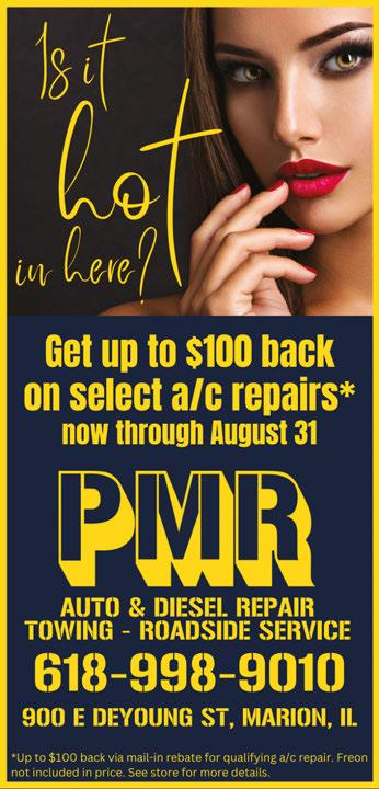 Sohowwillyoufareinthesouthern Illinoisheat?Willyourcarfreezeyouout? Orareyougoingtomeltquickerthanice cream?There'sonewaytomakesure you'recoolallsummerlong-call 618-998-9010toscheduleyoura/ccheck onyourvehicle.PMRworksonboth134A andthenew1234YFrefrigerantsystems, keeping you cool no matter what you drive.