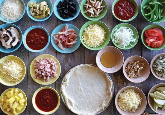 Everyone brings a topping to share... Everyone makes their own pizza, getting as creative as they like with toppings.
