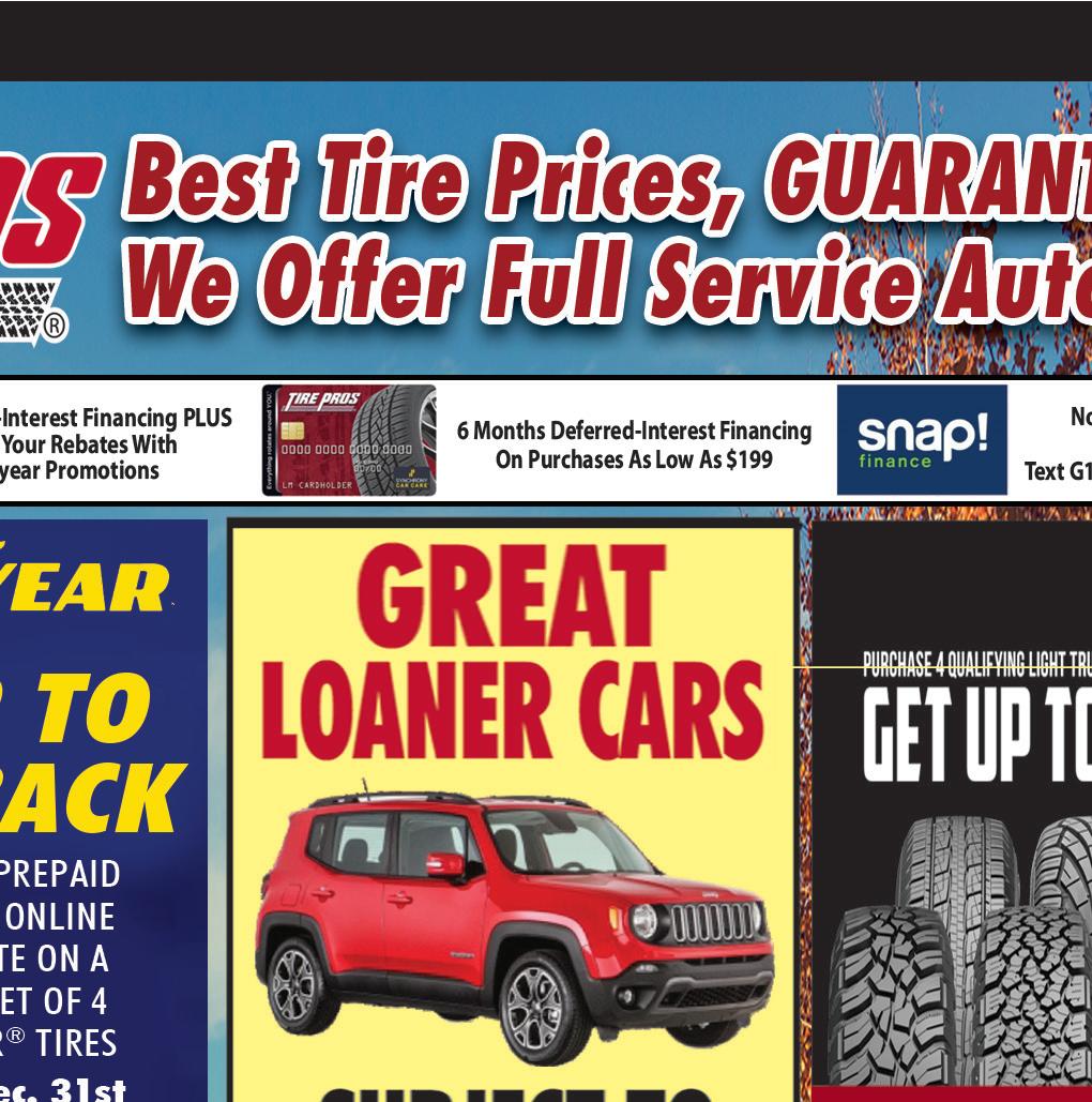 BARBERTON • NORTON November2020 Shop locally. Save locally. Thank your Veteran. Veterans Day Nov. 11th Family Owned & Operated Valid with coupon. Expires 12/3/20. Valid with coupon. Expires 12/3/20. Valid with coupon. Expires 12/3/20. LUBE, OIL AND FILTER $2995 Up to 5 quarts of Oil Valid with coupon. Expires 12/3/20. BRAKE JOB SPECIAL $40 OFF ANY BRAKE JOB Valid with coupon. Expires 12/3/20. BATTERIES Starting At $8995 Valid with coupon. Expires 12/3/20. WIPER BLADES $3995 Plus Tax FULL SYNTHETIC OIL CHANGE $5995 Up to 5 quarts of Oil Plus Tax COOLING SYSTEM SERVICE $5995 Includes up to 2 gallons of coolant Plus Tax $845 Classic 4pc Chicken Dinner All Day. CLOSED THANKSGIVING DAY ONE DAY ONLY 20% OFF all Gift Cards Friday,November27,2020. Nocouponneeded11am-9pm Tue thru Fri 11-3 Breast & Whole Wing & 2 Sides Leg & Thigh & 2 Sides $695 No substitutions of pcs. No coupons or discounts with this special. Valid for these dinners only on specified dates and times. DINE-IN ONLY 825-9923 Mondays 11am-9pm Lunch $5 is Waiting for You at hopocangardens.com Buy 2 Chicken Dinners, Get 3rd FREE Not valid with Monday $8.45 specials. Not valid with other offers or discounts. Expires 12/3/20 CARRY OUT ONLY