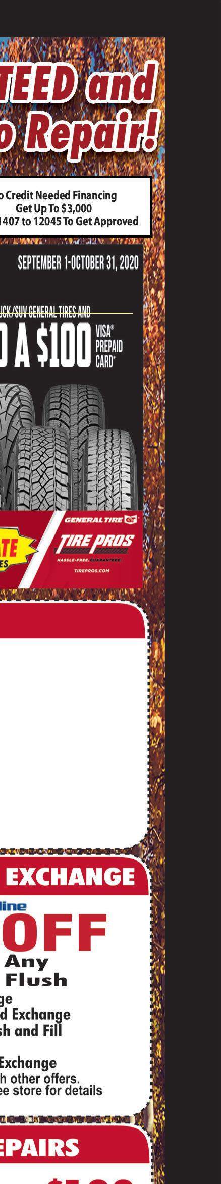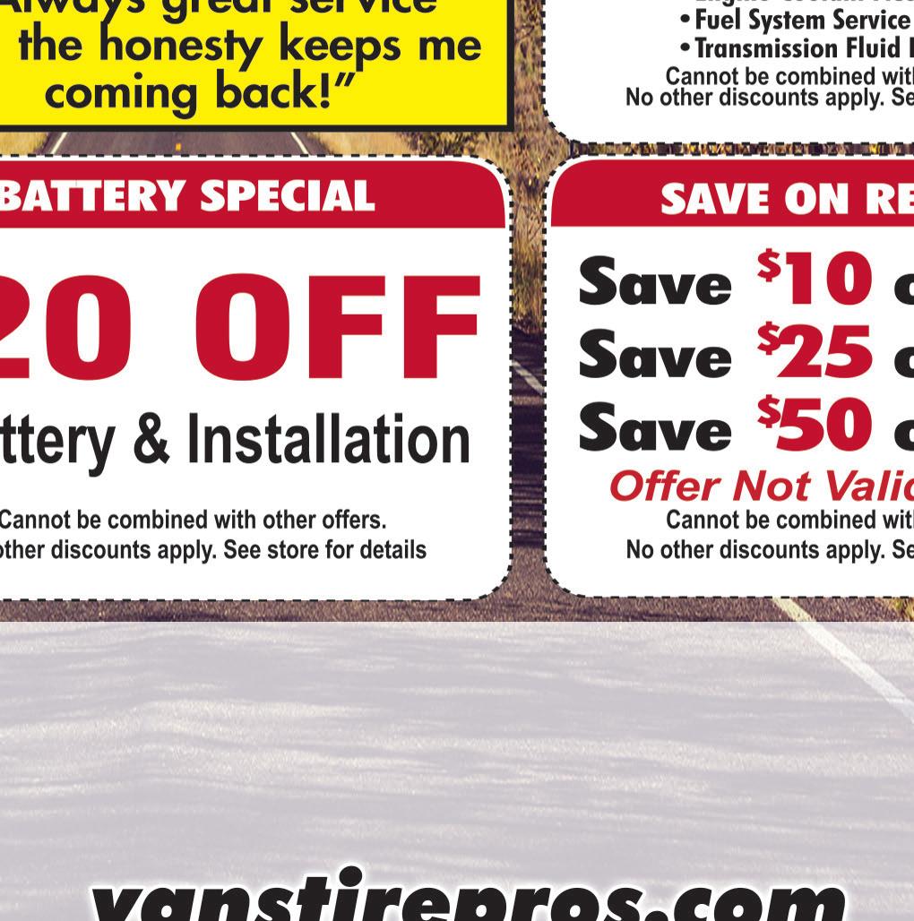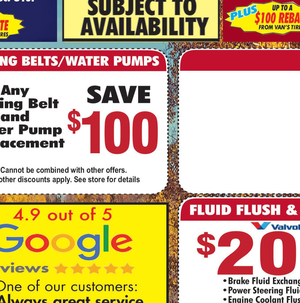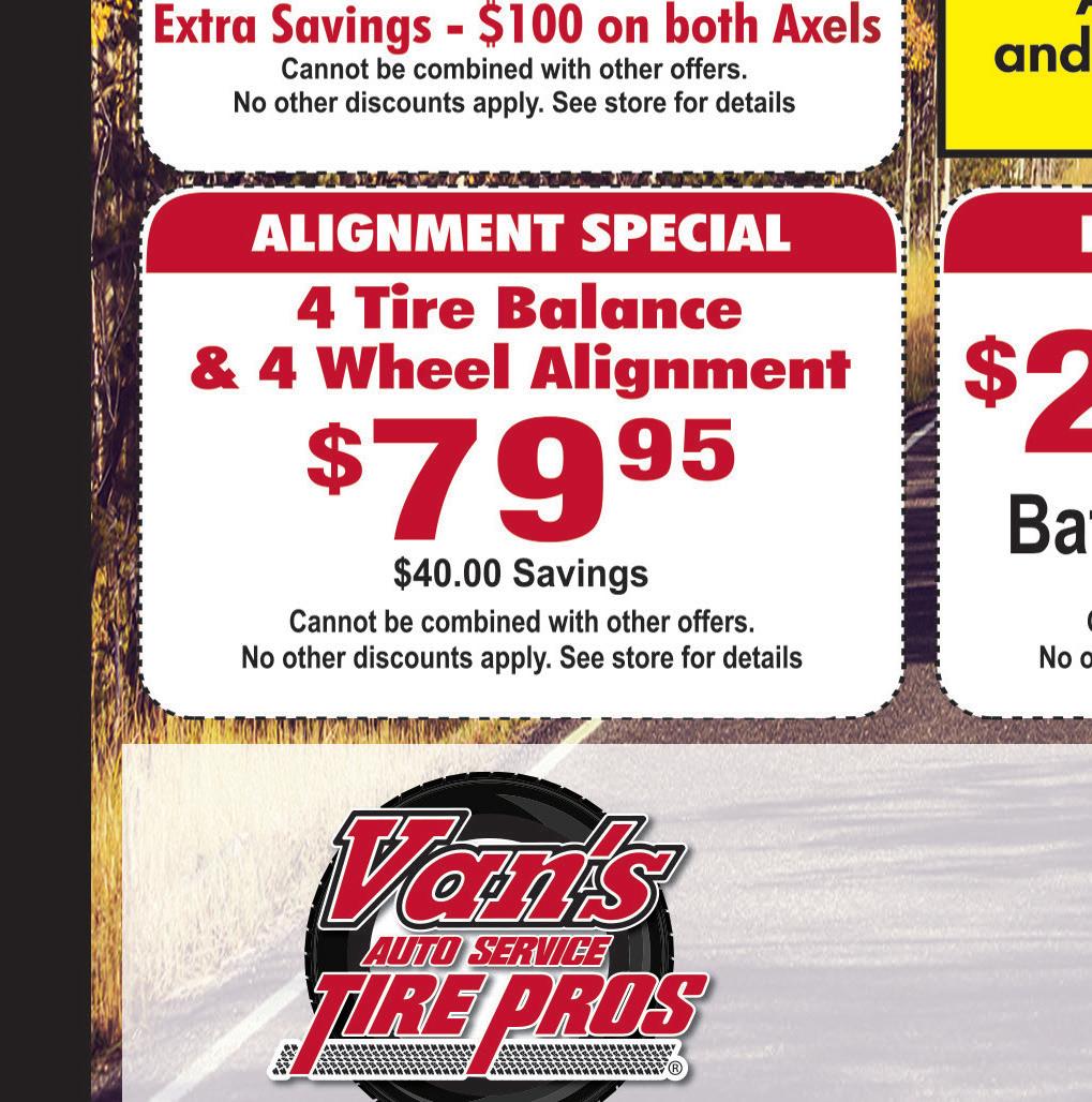 WWW.SPECIALTOUCHCLEANERS.COM 3039 Wadsworth Rd. • Norton OH 330-849-5116 Valvoline Full Service Standard Oil Change $24.99 $19.99 Most vehicles. 5 qts of 5W20 or 5W30. Valid only with coupon. Not valid with other offers. Expires 12-3-20 Town Money Saver Valvoline MAX Life OIL CHANGE $34.99 Up To 7,500 MILES Most vehicles. 5 qts of Semi-Synthetic 0W20 - 0W30. Valid only with coupon. Not valid with other offers. Expires 12-3-20 Town Money Saver WINTER SPECIAL Oil Change Wiper Blades Check Hoses RotateTires Coolant Flush CheckBrakes $94.99 Most vehicles. 5 qts of 5W30 or 10W30 conventional oil only. Valid only with coupon. Not valid with other offers. Expires 12-3-20. Town Money Saver FRONT WHEEL ALIGNMENT FREE Valid only with coupon. Not valid with other offers. Expires 12-3-20 Town Money Saver SCARY DEAL $20 OFF ANY REPAIR OVER $100 $40 OFF ANY REPAIR OVER $200 Valid only with coupon. Not valid with other offers. Expires 12-3-20 Town Money Saver with purchase of 4 Tires Full Service Auto Repair Monday - Friday 8:00 am - 5:00 pm Specialize in Foreign, Domestic & Diesel All City, Government & School Workers Receive 5% OFF Any Repair! COOLANT FLUSH $49.99 $69.99 NEW We are a State Certified E Center! $99.99 SAVE $20 Valid only with coupon. Not valid with other offers. Expires 12-3-20 Town Money Saver