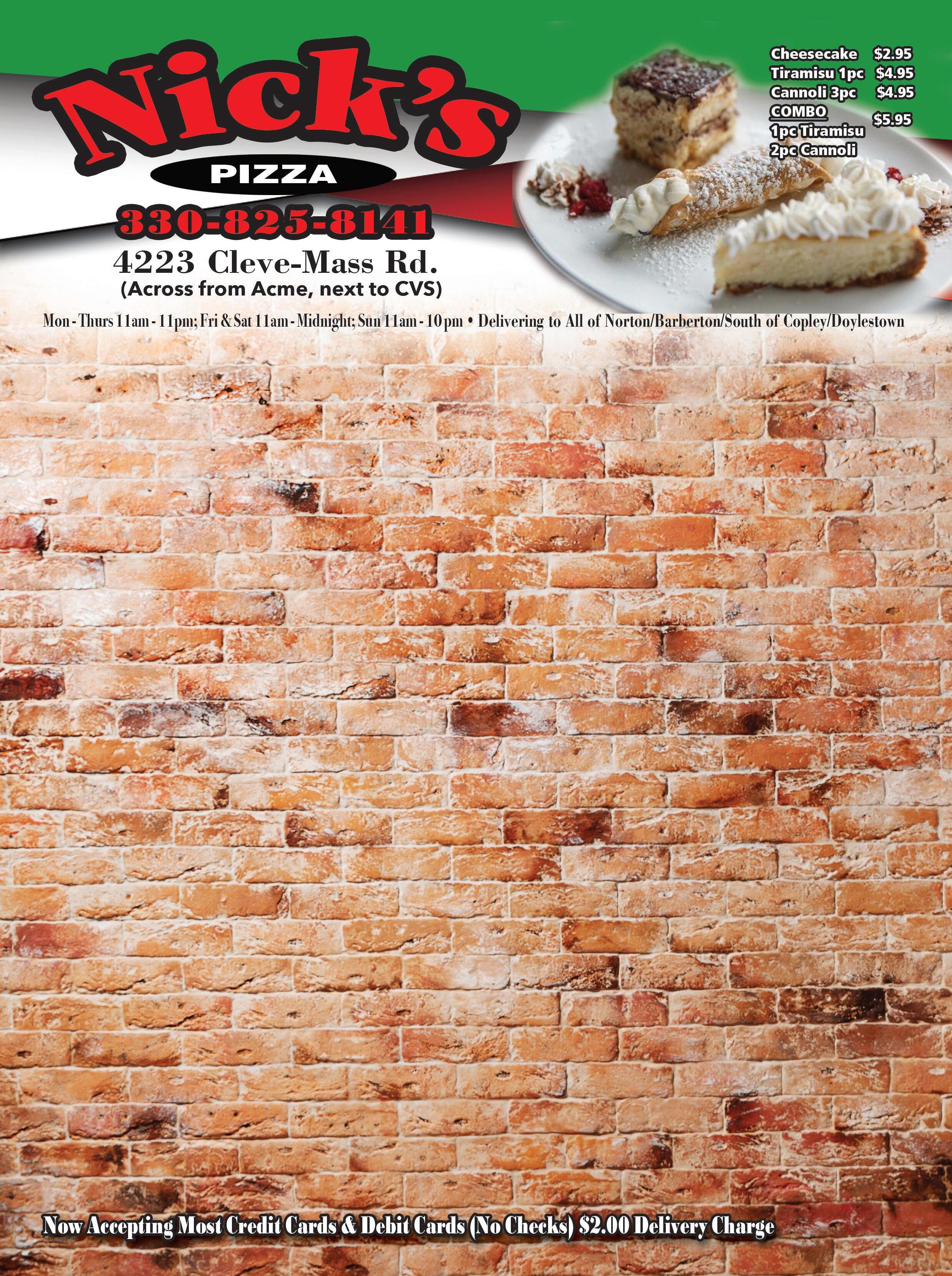 12” Medium 8 Cut 1-Item Pizza $695 OR 2 FOR Carry-out or delivery. Limit One Coupon Per Customer. Valid ONLY with Coupon. Expires 12/3/20 Carry-out or delivery. Limit One Coupon Per Customer. Valid ONLY with Coupon. Expires 12/3/20 Carry-out or delivery. Limit One Coupon Per Customer. Valid ONLY with Coupon. Expires 12/3/20 Carry-out or delivery. Limit One Coupon Per Customer. Valid ONLY with Coupon. Expires 12/3/20 Carry-out or delivery. Limit One Coupon Per Customer. Valid ONLY with Coupon. Expires 12/3/20 Carry-out or delivery. Limit One Coupon Per Customer. Valid ONLY with Coupon. Expires 12/3/20 Carry-out or delivery. Limit One Coupon Per Customer. Valid ONLY with Coupon. Expires 12/3/20 Carry-out or delivery. Limit One Coupon Per Customer. Valid ONLY with Coupon. Expires 12/3/20 Carry-out or delivery. Limit One Coupon Per Customer. Valid ONLY with Coupon. Expires 12/3/20 Carry-out or delivery. Limit One Coupon Per Customer. Valid ONLY with Coupon. Expires 12/3/20 $1295 12” Medium 8 Cut Unlimited Topping Pizza $1095 OR 2 FOR $1595 14” Large 10 Cut Unlimited Topping Pizza $1395 OR 2 FOR $1995 16” Jumbo 12 Cut Unlimited Topping Pizza $1595 OR 2 FOR $2395 Carry-out or delivery. Limit One Coupon Per Customer. Valid ONLY with Coupon. Expires 12/3/20 Carry-out or delivery. Limit One Coupon Per Customer. Valid ONLY with Coupon. Expires 12/3/20 Carry-out or delivery. Limit One Coupon Per Customer. Valid ONLY with Coupon. Expires 12/3/20 Carry-out or delivery. Limit One Coupon Per Customer. Valid ONLY with Coupon. Expires 12/3/20 14” Large 1-Item Pizza & 8pc Chicken & JoJo’s $2395 16” Jumbo 1-Item Pizza & Large Antipasta Salad with Dressing $1895 12” Medium 1-Item Pizza & 4pc Chicken $1695 Carry-out or delivery. Limit One Coupon Per Customer. Valid ONLY with Coupon. Expires 12/3/20 Carry-out or delivery. Limit One Coupon Per Customer. Valid ONLY with Coupon. Expires 12/3/20 Family Feast #2 $2995 16” 1-Item Pizza, 12pc Chicken & JoJo’s, Pint of Coleslaw & 6 Biscuits Carryout Special 10 pc All Dark Chicken (legs & thighs) with 10 JoJo’s $1295 OR 20 pc All Dark Chicken (legs & thighs) with 20 JoJo’s $2195 Lunch Specials • 11am to 3pm • 7 Days a Week 14” Large 10 Cut 1-Item Pizza $795 OR 2 FOR $1495 16” Jumbo 12 Cut 1-Item Pizza $895 OR 2 FOR $1690 12pc Chicken, 12 JoJo’s & Garlic Dip $1795 OR 20pc Chicken, 20 JoJo’s & Garlic Dip $2795 Sheet 1-Item Pizza $2195 OR 2 FOR $4095 16” Jumbo 2-Item Pizza & 24 Wings $2795 16” Jumbo 12 Cut 1-Item Pizza, 10pc Mixed Chicken, 10 JoJo’s & Garlic Dip $2795 Family Feast #1 20 Slices of Pizza (Half Sheet 1-Item) 20 Wings & 20 JoJo’s $3395 Small Gyro & 5 JoJo’s Any 8” Sub & 5 JoJo’s 3pc Chicken & 5 JoJo’s Small 1-Item Pizza & 5 JoJo’s Any 12” Footlong Sub NEW DESSERTS