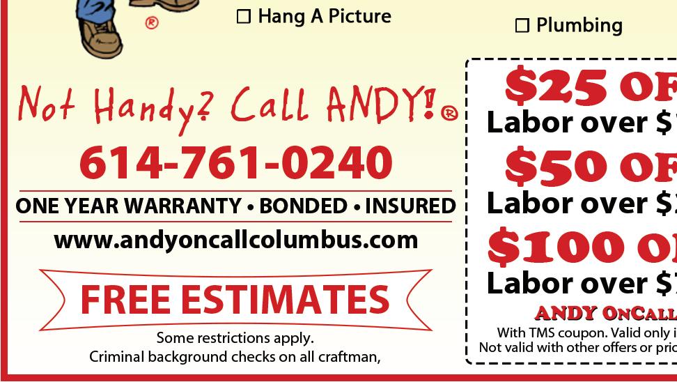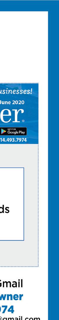 SOFT WASH CLEANING & SANITIZING FOR ALL EXTERIOR SURFACES Homes • Roofs • Decks Concrete • Awnings Before Before Before After Before After After After House Cleaning Awning Cleaning Concrete Cleaning & Sealing Roof Cleaning A MOBILE CLEANING SYSTEM We specialize in safely and effectively removing dirt, mold, mildew and fungus from all outdoor surfaces. • Houses • Siding • Decks • Wood Trim • Awnings • Porches • Concrete • Garage Floors • Rock & Stone • Gutters & Screens • Roofs • Patios • Restaurants • Dumpster Pads • Roofs HOUSE WASH Steam Clean House Wash (up to 2,000 sf ft.) ONLY $17999 Not valid with any other o ers. Expires 7/15/20 HOUSE WASH Steam Clean House Wash (up to 2,500 sf ft.) ONLY $19999 Not valid with any other o ers. Expires 7/15/20 614-777-9306 info@masterblasterpowerwash.com www.masterblasterpowerwash.com MEGA TUNEUP SPECIAL Add $10 more for bagless units **prices valid until 7/15/20 at all locations $8999 25%OFF LIST PRICE ALL BAGS & FILTERS INCLUDING DYSON, SHARK & NOW ORECK Carmen’s Vacuum Not valid with any other offers. Expires 7/15/20. Carmen’s Vacuum Not valid with any other offers. Expires 7/15/20. Carmen’s Vacuum Not valid with any other offers. Expires 7/15/20. For ALL Vacuums & Steam Cleaners ULTIMATE TUNEUP SPECIAL Should be Annually • Clean Motor • Lube Agitator • Adjust Brushes • Clean Brushroll • Check Bearings • Install Bag & Belt • Clean Filters • Clean Bag Housing $5999 Add $10 more for bagless units Carmen’s Vacuum WESTERVILLE 320 S. State St. 614-882-8400 NORTH 9709 Sawmill Rd. 614-761-0199 CENTRAL 5520 N. High St. 614-846-9915 SHOP ONLINE 24/7 www.carmensvacuum.com CORPORATE (EAST) 4585 Poth Rd. 614-864-5095 NEW SupraQuik Portable Canister Vacuum RSQ1 2 Year Warranty Good for Cars, Stairs and Rugs 4.5 lbs. Attachments Included 25-foot cord Made in USA R10E 5.5 Amps Wood Brushroller Headlight Soft Furniture Guard Rubber Handle Grip 30 Foot Cord • 3 Year Warranty Combination Package $34999 German Made U-1 Home Care • Patented Swivel For Maximum Maneuverability • Automatic Carpet Height Adjustment • Anti-Tipping Device For Enhanced Stability • Great For Allergies & Pets Complete C3 Homecare Plus • Hospital Grade Dust Air Filtration • Adjustable Handle Controls • 1,200 Watt Vortex Motor Save $15000 Save $20000 Bissell 9595-R Carmen’s Vacuum Not valid with any other offers. Expires 7/15/20. Includes diseinfecting and sanitizing. Kills ALL viruses including COVID-19 • Factory Reconditioned • Cyclonic Bagless System • 90-Day Motor main parts Warranty • Lightweight with Powerful Suction $4999