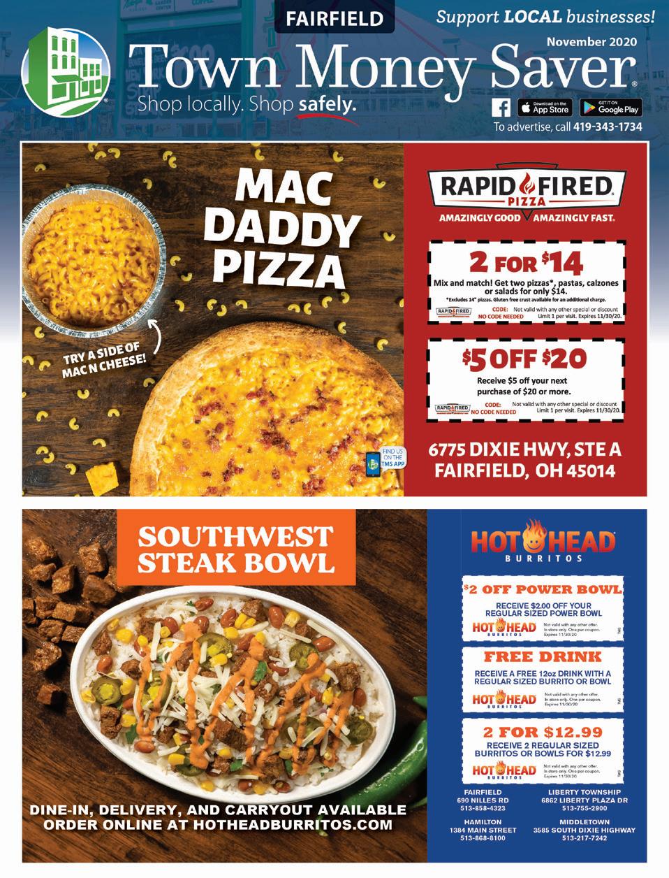 FAIRFIELD November 2020 Shop locally. Shop safely. Support LOCAL businesses! To advertise, call 4193431734 DINE-IN, DELIVERY, AND CARRYOUT AVAILABLE ORDER ONLINE AT HOTHEADBURRITOS.COM TMS TMS TMS RECEIVE $2.00 OFF YOUR REGULAR SIZED POWER BOWL TMS $2 OFF POWER BOWL RECEIVE A FREE 12oz DRINK WITH A REGULAR SIZED BURRITO OR BOWL FREE DRINK RECEIVE 2 REGULAR SIZED BURRITOS OR BOWLS FOR $12.99 2 FOR $12.99 Not valid with any other offer. In store only. One per coupon. Expires 11/30/20 Not valid with any other offer. In store only. One per coupon. Expires 11/30/20 Not valid with any other offer. In store only. One per coupon. Expires 11/30/20 MIDDLETOWN 3585 SOUTH DIXIE HIGHWAY 513-217-7242 HAMILTON 1384 MAIN STREET 513-868-8100 FAIRFIELD 690 NILLES RD 513-858-4323 LIBERTY TOWNSHIP 6862 LIBERTY PLAZA DR 513-755-2900