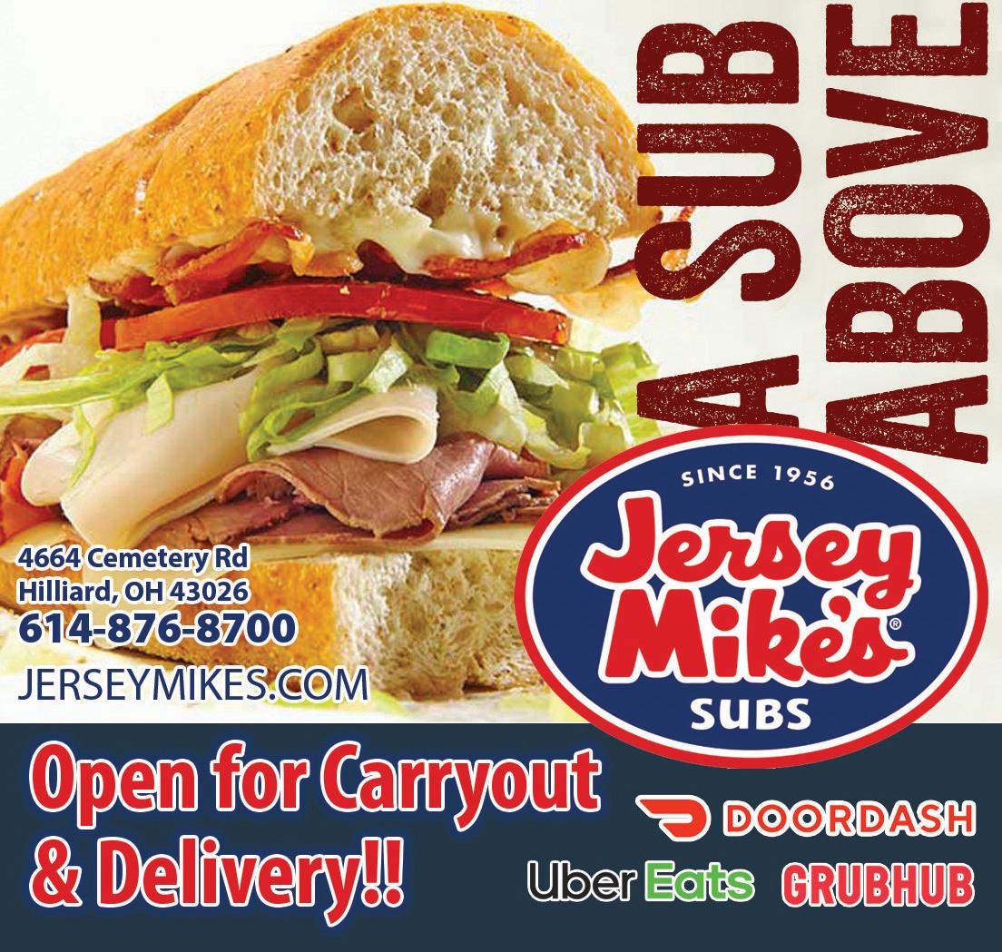 HILLIARD July/August 2020 Shop locally. Shop safely. Support LOCAL businesses! Award Winning ing Pizza WINNER! Taste of Hilliard Over 60 Years of Making Great Pizza! Judges Choice Award 2 Years In A Row! 614-777-9680 2149 Hilliard-Rome Road Order Online at AngesPizzaOnline.com Award Winning Chicago Stuffed Pizza WINNER TASTE OF HILLIARD JUDGE’S CHOICE 2011 & 2012 Ange’s Pizza 614-777-9680 Limit 1 coupon per order. Valid with TMS coupon only. Not valid with any other coupon or offer. Exp 8/15/20. Ange’s Pizza 614-777-9680 Limit 1 coupon per order. Valid with TMS coupon only. Not valid with any other coupon or offer. Exp 8/15/20. Ange’s Pizza 614-777-9680 Limit 1 coupon per order. Valid with TMS coupon only. Not valid with any other coupon or offer. Exp 8/15/20. Ange’s Pizza 614-777-9680 Limit 1 coupon per order. Valid with TMS coupon only. Not valid with any other coupon or offer. Exp 8/15/20. $2.50 OFF Any 2 Large Pizzas $3.00 OFF Any 2 XL Pizzas $0.35 OFF Any Sub Limit 10 $0.75 OFF Any Medium Pizzas – Limit 2 Sawchuk Jewelers www.sawchukjewelers.com 614-219-1385 Jewelry Sales • Jewelry Repair • Custom Jewelry Design • Buying Gold CELEBRATING OUR 11TH YEAR IN BUSINESS! 5093 Cemetery Road • Hilliard Sawchuk Jewelers HOURS MAY VARY. PLEASE CALL BEFOREHAND. WE’RE OPEN FOR DINE-IN! DELIVERY & CARRY OUT AVAILABLE $5 OFF with purchase of 2 adult dinners 1 coupon per group. Cannot be combined with other offers. Expires 08/15/2020 TMS $4 OFF with purchase of 2 lunches 1 coupon per group. Cannot be combined with other offers. Expires 08/15/2020 TMS MON-SAT 9am-9pm • SUN 10am-8pm FREE SMOOTHIE BUY ANY SIZE SMOOTHIE, GET A 2ND SMOOTHIE OF EQUAL OR LESSER VALUE FREE $1.00 OFF Any Healthy Wrap or Freshly Squeezed Juice $15 4-Pack Smoothie Deal Limit ONE COUPON PER GROUP PER DAY. Offer cannot be combined. EXPIRES 09/15/20 Valid at Pulp Hilliard only. Limit ONE COUPON PER GROUP PER DAY. Offer cannot be combined. EXPIRES 09/15/20 Valid at Pulp Hilliard only. Limit ONE COUPON PER GROUP PER DAY. Offer cannot be combined. EXPIRES 09/15/20 Valid at Pulp Hilliard only. 3664 Fishinger Blvd. (Mill Run) Hilliard/UA Now Delivering with @pulphilliard 4 Small Tropical or Classic Smoothies ONLY