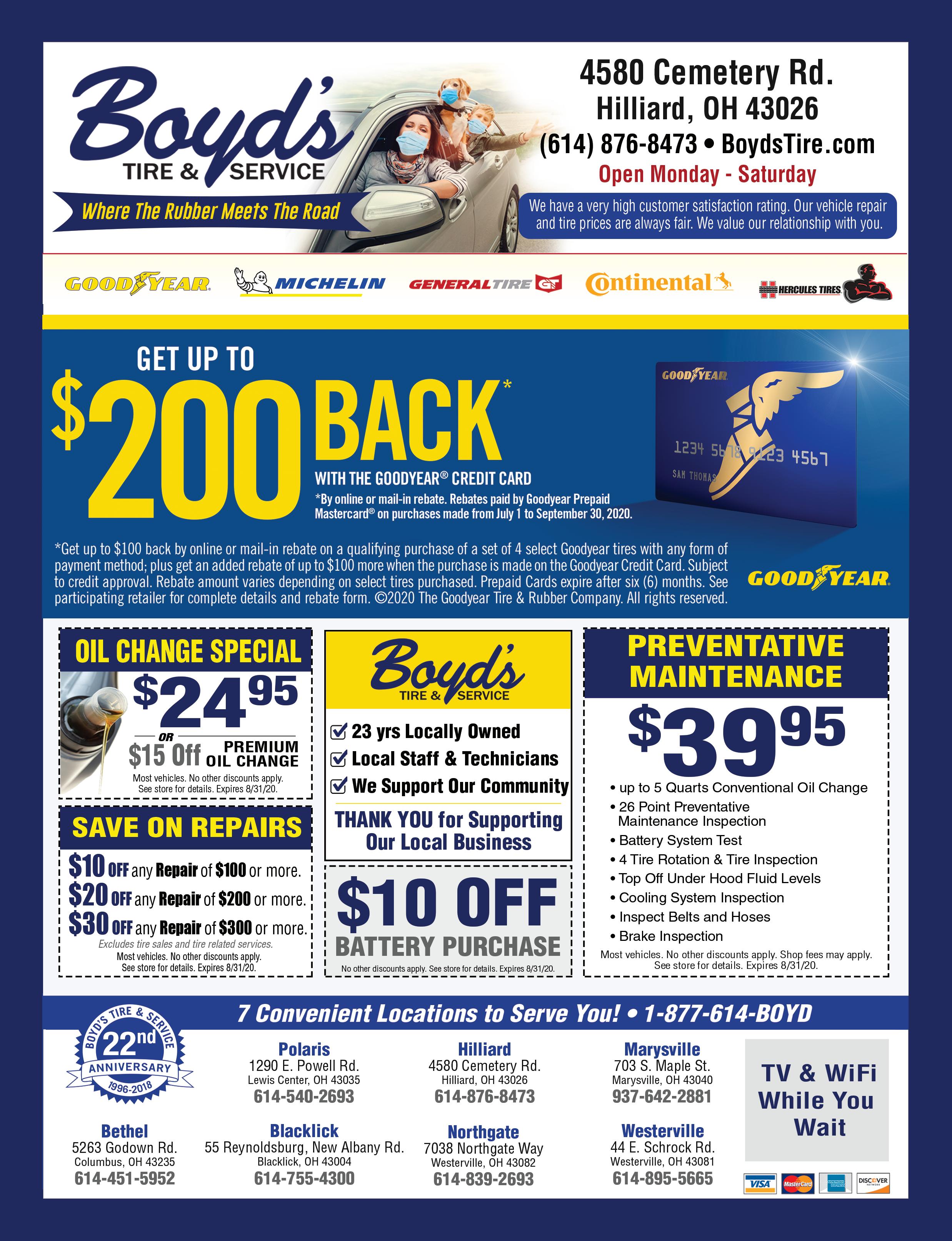 HOURS: MONFRI 7:30AM7:00PM•SAT 8:00AM4:00PM CLOSED SUNDAY Family Owned and Operated! Not valid with any other offers or discounts. richeygoodyear.com Expires 8/15/20. 4983 Roberts Road Hilliard, Ohio 614-777-1110 Not valid with any other offers or discounts. richeygoodyear.com Expires 8/15/20. 4983 Roberts Road Hilliard, Ohio 614-777-1110 $100.00-$199.99 Get $10.00 Off $200.00-$299.99 Get $20.00 Off $300.00 or More Get $30.00 Off does not apply to tire purchases H H Sliding Scale Coupon H Not valid with any other offers or discounts. richeygoodyear.com Expires 8/15/20. 4983 Roberts Road Hilliard, Ohio 614-777-1110 H $2499 OR $10 OFF ANY SYNTHETIC BLEND OR FULL SYNTHETIC OIL CAR CARE PACKAGE $4499 Not valid with any other offers or discounts. richeygoodyear.com Expires 8/15/20. 4983 Roberts Road Hilliard, Ohio 614-777-1110 H Not valid with any other offers or discounts. richeygoodyear.com Expires 8/15/20. 4983 Roberts Road Hilliard, Ohio 614-777-1110 H 10% OFF ALL FLUSHES (coolant, brake fluid, power steering fluid, transmission fluid, differential fluid) This service includes: • Lube, new filter & up to 5 quarts major brand oil (full synthetic oil $30 extra) • Complete tire rotation • Check tread depth on all 4 tires • Adjust air pressure to manufacturer’s specifications • Inspect and clean battery terminals and connections • Top off all fluids under the hood • Examine all belts and hoses for cracks and proper tension • Brake inspection 4983 Roberts Road Hilliard, Ohio 614-777-1110 $50OFF Not valid with any other offers or discounts. richeygoodyear.com Expires 8/15/20. Please present your military or veteran ID to receive your discount. Conventional Oil Change Includes: • Lube, where applicable • New oil filter installed • Up to 5 qts. major oil brand (brands vary) • Pumpkin spiced air freshener 4 TIRES WITH 4 WHEEL ALIGNMENT Call us today for appointments or schedule it online at our website! 4983 Roberts Road•Hilliard, OH www.richeytire.com | www.richeygoodyear.com 614-777-1110 FREE AIR CONDITIONING PERFORMANCE TEST (refrigerant extra) Follow us on Facebook, Twitter & Instagram! @RicheyTire