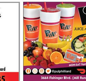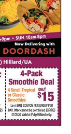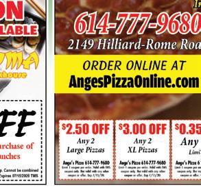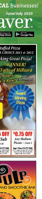 HILLIARD June/July 2020 Shop locally. Shop safely. Support LOCAL businesses! HOURS MAY VARY. PLEASE CALL BEFOREHAND. OPENING SOON DELIVERY & CARRY OUT AVAILABLE $5 OFF with purchase of 2 adult dinners 1 coupon per group. Cannot be combined with other offers. Expires 07/15/2020 TMS $4 OFF with purchase of 2 lunches 1 coupon per group. Cannot be combined with other offers. Expires 07/15/2020 TMS Award Winning ing Pizza WINNER! Taste of Hilliard Over 60 Years of Making Great Pizza! Judges Choice Award 2 Years In A Row! 614-777-9680 2149 Hilliard-Rome Road Order Online at AngesPizzaOnline.com Award Winning Chicago Stuffed Pizza WINNER TASTE OF HILLIARD JUDGE’S CHOICE 2011 & 2012 Ange’s Pizza 614-777-9680 Limit 1 coupon per order. Valid with TMS coupon only. Not valid with any other coupon or offer. Exp 7/15/20. Ange’s Pizza 614-777-9680 Limit 1 coupon per order. Valid with TMS coupon only. Not valid with any other coupon or offer. Exp 7/15/20. Ange’s Pizza 614-777-9680 Limit 1 coupon per order. Valid with TMS coupon only. Not valid with any other coupon or offer. Exp 7/15/20. Ange’s Pizza 614-777-9680 Limit 1 coupon per order. Valid with TMS coupon only. Not valid with any other coupon or offer. Exp 7/15/20. $2.50 OFF Any 2 Large Pizzas $3.00 OFF Any 2 XL Pizzas $0.35 OFF Any Sub Limit 10 $0.75 OFF Any Medium Pizzas – Limit 2 Sawchuk Jewelers www.sawchukjewelers.com 614-219-1385 Jewelry Sales • Jewelry Repair • Custom Jewelry Design • Buying Gold CELEBRATING OUR 11TH YEAR IN BUSINESS! 5093 Cemetery Road • Hilliard Sawchuk Jewelers MON-SAT 9am-9pm • SUN 10am-8pm FREE SMOOTHIE BUY ANY SIZE SMOOTHIE, GET A 2ND SMOOTHIE OF EQUAL OR LESSER VALUE FREE $1.00 OFF Any Healthy Wrap or Freshly Squeezed Juice $15 4-Pack Smoothie Deal Limit ONE COUPON PER GROUP PER DAY. Offer cannot be combined. EXPIRES 07/31/20 Valid at Pulp Hilliard only. Limit ONE COUPON PER GROUP PER DAY. Offer cannot be combined. EXPIRES 07/31/20 Valid at Pulp Hilliard only. Limit ONE COUPON PER GROUP PER DAY. Offer cannot be combined. EXPIRES 07/31/20 Valid at Pulp Hilliard only. 3664 Fishinger Blvd. (Mill Run) Hilliard/UA Now Delivering with @pulphilliard 4 Small Tropical or Classic Smoothies ONLY