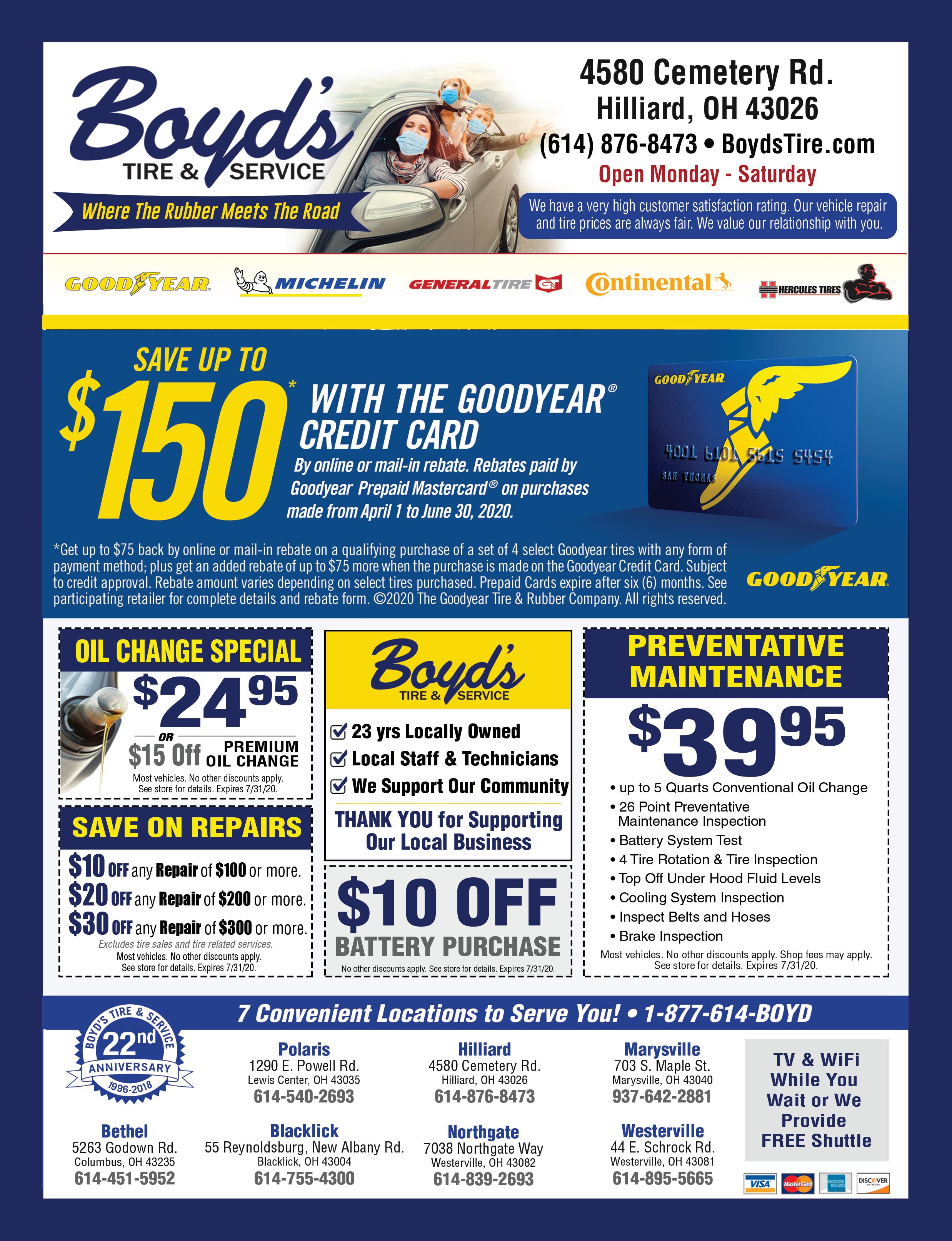 HOURS: MONFRI 7:30AM7:00PM•SAT 8:00AM4:00PM CLOSED SUNDAY Family Owned and Operated! Not valid with any other offers or discounts. richeygoodyear.com Expires 7/15/20. 4983 Roberts Road Hilliard, Ohio 614-777-1110 Not valid with any other offers or discounts. richeygoodyear.com Expires 7/15/20. 4983 Roberts Road Hilliard, Ohio 614-777-1110 $100.00-$199.99 Get $10.00 Off $200.00-$299.99 Get $20.00 Off $300.00 or More Get $30.00 Off does not apply to tire purchases H H Sliding Scale Coupon H Not valid with any other offers or discounts. richeygoodyear.com Expires 7/15/20. 4983 Roberts Road Hilliard, Ohio 614-777-1110 H $2499 OR $10 OFF ANY SYNTHETIC BLEND OR FULL SYNTHETIC OIL CAR CARE PACKAGE $4499 Not valid with any other offers or discounts. richeygoodyear.com Expires 7/15/20. 4983 Roberts Road Hilliard, Ohio 614-777-1110 H Not valid with any other offers or discounts. richeygoodyear.com Expires 7/15/20. 4983 Roberts Road Hilliard, Ohio 614-777-1110 H 10% OFF ALL FLUSHES (coolant, brake fluid, power steering fluid, transmission fluid, differential fluid) This service includes: • Lube, new filter & up to 5 quarts major brand oil (full synthetic oil $30 extra) • Complete tire rotation • Check tread depth on all 4 tires • Adjust air pressure to manufacturer’s specifications • Inspect and clean battery terminals and connections • Top off all fluids under the hood • Examine all belts and hoses for cracks and proper tension • Brake inspection 4983 Roberts Road Hilliard, Ohio 614-777-1110 $10 OFF Not valid with any other offers or discounts. richeygoodyear.com Expires 7/15/20. Please present your military or veteran ID to receive your discount. Conventional Oil Change Includes: • Lube, where applicable • New oil filter installed • Up to 5 qts. major oil brand (brands vary) • Pumpkin spiced air freshener WHEEL ALIGNMENT Call us today for appointments or schedule it online at our website! 4983 Roberts Road•Hilliard, OH www.richeytire.com | www.richeygoodyear.com 614-777-1110 FREE AIR CONDITIONING PERFORMANCE TEST (refrigerant extra)