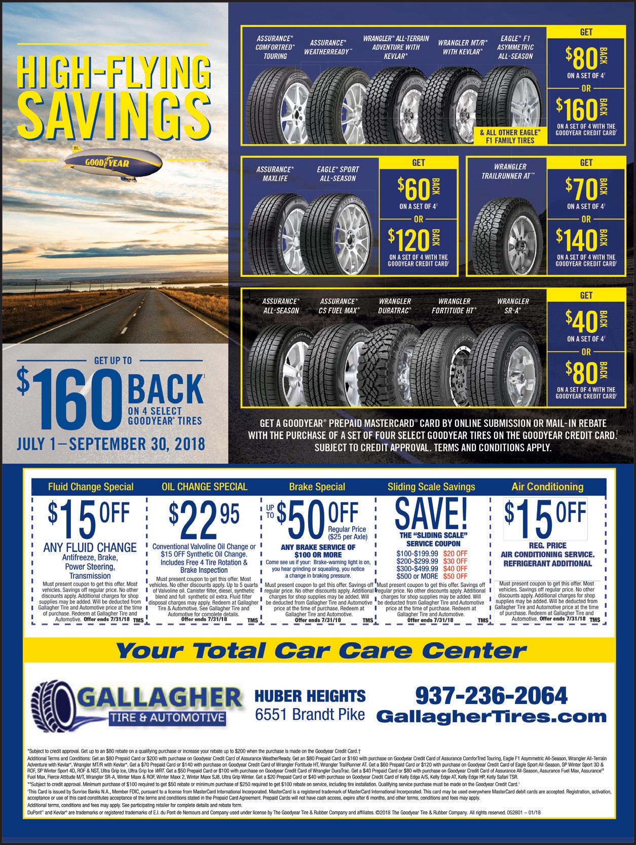 Goodyear retailers and websites. Offers valid only for U.S. residents who are individual consumers with mailing addresses in the U.S. and U.S. territories. Commercial fleets are not eligible for these rebates. Not valid on previous offers. Rebate forms must be postmarked no later than 1/31/20. Base portion of rebate offered by Goodyear, and bonus portion of rebate offered by Citibank, N.A. Goodyear is not affiliated with Mastercard. Additional terms, conditions, and fees apply. See Goodyear Credit Card is issued by Citibank, N.A. ® are trademarks or registered trademarks of E.I. du Pont de Nemours and Company used under license by The Goodyear Tire & Rubber Company and affiliates. ©2019 The Goodyear Tire & Rubber Company. All rights reserved. By online or mail-in rebate. Rebates paid by Goodyear Prepaid Mastercard® on purchases made from October 1 to December 31, 2019. ALL-TERRAIN KEVLAR ASSURANCE ® MAXLIFE ™ ASSURANCE ® ALL-SEASON ULTRA GRIP ICE GET $75 AN ADDED BONUS OF $75 GET 50 ADDED BONUS OF 50 BACK* ON A SET OF 4 SELECT GOODYEAR TIRES AN ADDED BONUS OF MORE* WHEN YOU USE THE GOODYEAR CREDIT CARD YOUR TOTAL CAR FLUID CHANGE SPECIAL BRAKE $ 50 ANY FLUID CHANGE Antifreeze, Brake, Power Steering, Transmission ANY BRAKE OF $100 Come Brake-warning grinding or a change Must present coupon to get this offer. Most vehicles. Savings off regular price. No other discounts apply. Additional charges for shop supplies may be added. Will be deducted from Gallagher Tire and Automotive price at the time of purchase. Redeem at Gallagher Tire and Automotive. Offer ends 10/31/19 OIL CHANGE SPECIAL $ 22 95 Conventional Valvoline Oil Change or $15 OFF Synthetic Oil Change. Includes Free 4 Tire Rotation & Brake Inspection Must present coupon to get this offer. Most vehicles. No other discounts apply. Up to 5 quarts of Valvoline oil. Canister filter, diesel, synthetic blend and full synthetic oil extra. Fluid filter disposal charges may apply. Redeem at Gallagher Tire and Automotive. See Gallagher Tire and Automotive for complete details. Offer ends 10/31/19 UP TO $ 15 OFF *Get up to $75 back by online or mail-in rebate on a qualifying purchase of a set of 4 select Goodyear tires with any form of payment method; plus Prepaid Card with purchase on the Goodyear Credit Card of: Assurance WeatherReady, Eagle Exhilarate, Eagle F1 Asymmetric All-Season excluding Assurance ComforTred Touring, Wrangler DuraTrac, and Wrangler Fortitude HT. Get a $25 Prepaid Card with purchase or $50 Prepaid Card with purchase Ice WRT LT, WinterCommand, and WinterCommand LT. Rebates paid in the form of a Goodyear Prepaid Mastercard®. This Prepaid Card is issued by Sunrise Banks N.A., Member FDIC, pursuant to a license Mastercard debit cards are accepted. Registration, activation, acceptance, or use of this Prepaid Card constitutes acceptance of the terms and conditions Offers available only at participating U.S. Goodyear retailers and websites. Offers valid only for U.S. residents who are individual consumers with Goodyear rebate offers. Rebate forms must be postmarked no later than 1/31/20. Base portion of rebate offered by Goodyear, and bonus portion of rebate forms. Goodyear Credit Card is issued by Citibank, N.A. DuPont™ and Kevlar® are trademarks or registered trademarks of E.I. du Pont de Nemours and Company used under license by The Goodyear Tire & By online or mail-in rebate. Rebates paid by Goodyear Prepaid FORTITUDEWRANGLERHT WRANGLER DURATRAC® COMFORTREASSURANCE D TOURING GET $50 BACK* ON A SET OF 4 SELECT GOODYEAR TIRES AN ADDED BONUS OF $50 MORE WHEN YOU USE THE GOODYEAR CREDIT CARD dit approval. Get a $75 Prepaid Card with purchase or $150 Prepaid Card with purchase on the Goodyear Credit Card of: Assurance WeatherReady®, Assurance® ComforTred Touring, Assurance MaxLife®, Wrangler® All-Terrain Adventure with Kevlar®, Wrangler DuraTrac®, Wrangler Fortitude HT® (excluding C-Type), Wrangler TrailRunner AT®, Eagle Exhilarate®, WinterCommand®, WinterCommand® LT and WinterCommand® Ultra. Get a $50 epaid Card with purchase on the Goodyear Credit Card of: Kelly Edge® HT, Kelly Edge AT®, Kelly Edge MT®, Kelly® Safari® TSR, Kelly Edge HP®, Kelly Edge All-Season®, Kelly Edge All-Season® Performance and Kelly Winter Access™. If you receive a Goodyear Prepaid Mastercard®, then the following applies: Rebates paid in the form of a Goodyear Prepaid Mastercard®. This Prepaid Card is issued by Sunrise Banks N.A., Member FDIC, ation, activation, acceptance, or use of this card constitutes acceptance of the terms and conditions nce other terms, conditions, and fees may apply. If you receive a Goodyear Visa Prepaid Card, then the following applies: Visa Prepaid Card is issued by MetaBank®, N.A., Member FDIC, pursuant to a license from Visa U.S.A. Inc. ed funds will forfeit after the valid thru date. Card terms and conditions apply. MetaBank does not endorse or sponsor the Goodyear Credit Card offer. Offers available only at participating U.S. Goodyear retailers and websites. ercial fleets are not eligible for these rebates. Not valid on previous purchases. Cannot be combined with other Goodyear tire rebate offers. Rebate forms must be postmarked no later than 1/31/21. Base portion of rebate offered by Goodyear, and bonus portion of rebate offered by Citibank, N.A. Goodyear is not affiliated with Mastercard. Additional terms, conditions, and fees apply. See participating retailer for complete details and rebate forms. Goodyear Credit Card is issued by Citibank, N.A. DuPont™ and Kevlar® are trademarks or registered trademarks of E.I. du Pont de Nemours and Company used under license by The Goodyear Tire & Rubber Company and affiliates. †Terms and conditions apply. See store associate for details, or for more information, visit https://www.goodyear.com/en-US/tire-warranty/30-day-pledge. ©2020 The Goodyear Tire & Rubber Company. All rights reserved. Must present coupon to get this offer. Savings off 