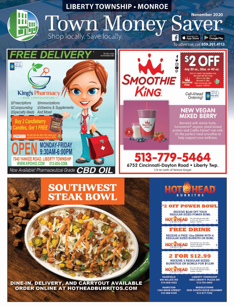 LIBERTY TOWNSHIP • MONROE November 2020 Shop locally. Save locally. To advertise, call 859.391.4113 þPrescriptions þCompounding þSpecialty Meds FIND US ON THE TMS APP FREE DELIVERY *20 mile radius no minimum order þImmunizations þVitamins & Supplements And More! * Buy 2 Candleberry DINE-IN, DELIVERY, AND CARRYOUT AVAILABLE ORDER ONLINE AT HOTHEADBURRITOS.COM TMS TMS TMS RECEIVE $2.00 OFF YOUR REGULAR SIZED POWER BOWL TMS $2 OFF POWER BOWL RECEIVE A FREE 12oz DRINK WITH A REGULAR SIZED BURRITO OR BOWL FREE DRINK RECEIVE 2 REGULAR SIZED BURRITOS OR BOWLS FOR $12.99 2 FOR $12.99 Not valid with any other offer. In store only. One per coupon. Expires 11/30/20 Not valid with any other offer. In store only. One per coupon. Expires 11/30/20 Not valid with any other offer. In store only. One per coupon. Expires 11/30/20 MIDDLETOWN 3585 SOUTH DIXIE HIGHWAY 513-217-7242 HAMILTON 1384 MAIN STREET 513-868-8100 FAIRFIELD 690 NILLES RD 513-858-4323 LIBERTY TOWNSHIP 6862 LIBERTY PLAZA DR 513-755-2900 $2 OFF Any 20 oz., 32oz. or 40 oz. TMS Valid at Liberty Twp location only. Not valid with $5 Friday offer or any other discount or offer. One coupon per visit. Expires 11/30/20. FIND US ON THE TMS APP Call-Ahead Ordering! 513-779-5464 6752 Cincinnati-Dayton Road • Liberty Twp. 1/4 mi north of Yankee Kroger NEW VEGAN MIXED BERRY Blended with whole fruits, Sunwarrior ® organic plant-based protein and Califia Farms ® oat milk, it’s the perfect meal smoothie to help support your wellness.