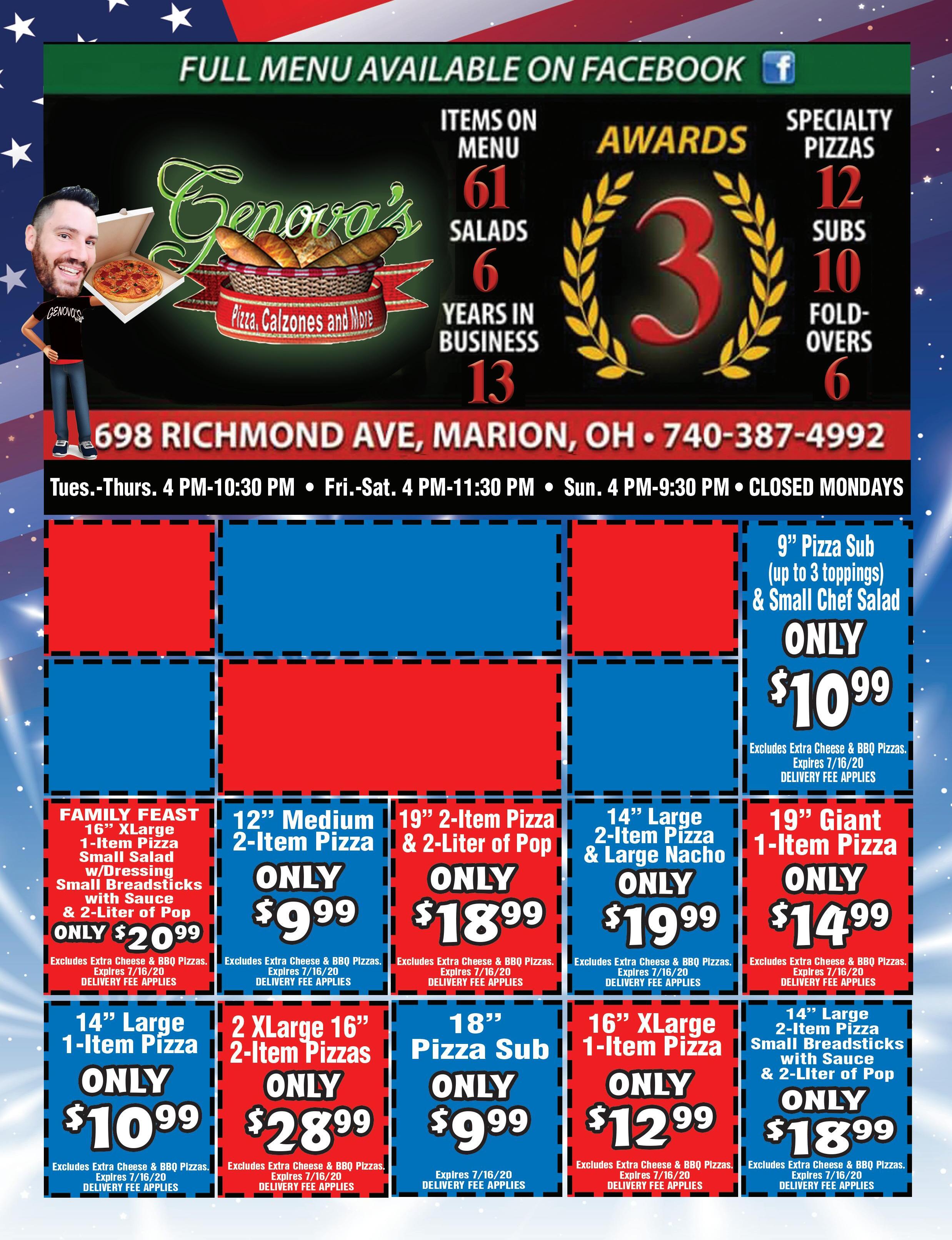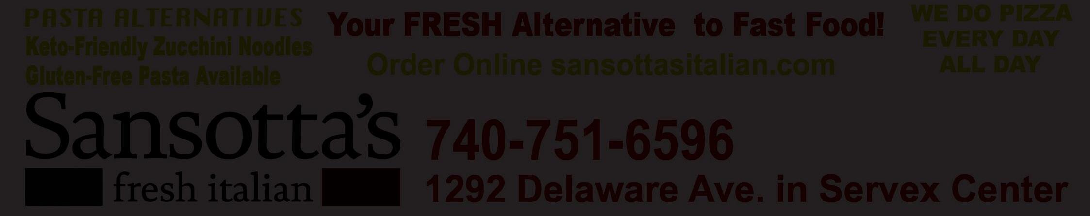 $1.00 OFF Daily Specials $22.95 Any Pasta Bowl or Salad Must present coupon. Not valid with other offers. Expires 7/16/20. Every Thursday is Family Recipe Italian Baked Chicken 3pc only $3.99 (breast, thigh & leg) Mon. Homemade Lasagna $925 Tues. Philly Cheese Steak $850 Thur. 3pc Family Recipe Italian Baked Chicken $399 (Breast, Thigh & Leg) Saturday ALL DAY 10pc Ravioli $799 Pick Your Sauce, Pick Your Toppings Add Meat $199 Fri./Sat. END OF SUMMER SPECIAL ALL DAY Bud & Bud Light $150 Fri./Sat./Sun. 14” Cheese Pizza $800 14” Toppings ea. $125 10” Cheese Pizza $500 10” Toppings ea. $100 Gluten Free & Cauliflower Crust Now Available! WE CATER! We are taking extra precautions! With all the concerns surrounding Covid-19, we want you to know we are doing everything possible to ensure a safe transaction. Call or order online and we'll have it ready for you when you arrive. *Due to product availability prices are subject to change without notice. We are open again on Sundays! Freezeable Meals! 740-751-6596 Reduce your time being out! These meals are pre-made and designed to store in your refrigerator or freezer until ready to heat and eat. $5.25 GRAB & GO