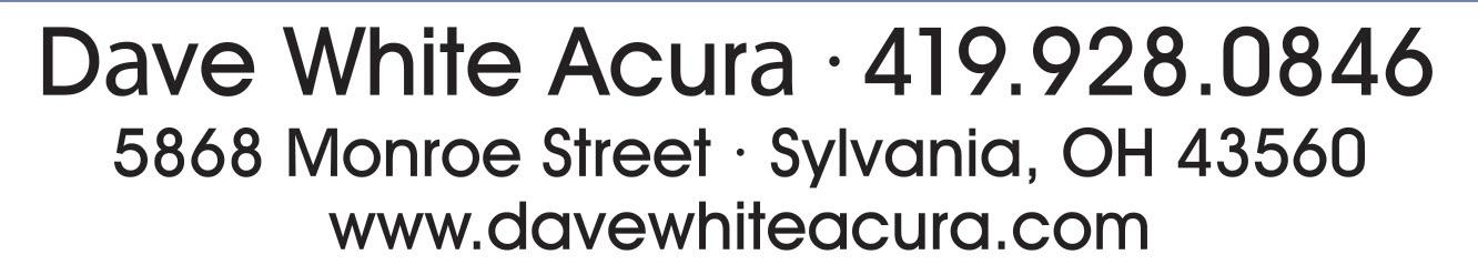 acquisition fee. Dealer contribution may vary and could affect actual lease payment. Total monthly payments $15,084.00. Option to purchase at lease end $25,494.00. ***Closed-end lease for 2020 RDX 10 speed automatic vehicles (TC1H3LJNW) available from September 1, 2020 through October 31, 2020, available to well qualified lessees approved by Acura Financial Services. Not all lessees will qualify. Higher lease rates apply for lessees with lower credit ratings. Lease offers vary based on MSRP. MSRP $38,825.00 (includes destination, excludes tax, license, title fee, registration, documentation fee, options, insurance, and the like). Actual net capitalized cost $33,094.73. Net capitalized cost includes $595 acquisition fee. Dealer contribution may vary and could affect actual lease payment. Total monthly payments $14,724.00. Option to purchase at lease end $22,906.75. Must take new retail delivery of vehicles from dealer stock by October 31, 2020. Lessee responsible for maintenance, excessive wear/tear and 15 cents/mile over 10,000 miles/year for vehicles with MSRP less than $30,000.000, and 20 cents/mile over 10,000 miles/year for vehicles MSRP of $30,000.00 or more. See your Acura dealer for complete details. 2020 Acura MDX $419 9 Speed Automatic Featured Special Lease per month for 36 months** $2,999 total due at signing. 2020 Acura TLX $299 8 Speed Dual-Clutch Featured Special Lease per month for 36 months* $2,499 total due at signing. Includes down payment with no security deposit. Excludes taxes, titles and either dealer fees or documentary service fee. For well-qualified lessees. 2020 Acura RDX $409 10 Speed Automatic Featured Special Lease per month for 36 months*** $2,999 total due at signing. Includes down payment with no security deposit. Excludes taxes, titles and either dealer fees or documentary service fee. For well-qualified lessees. THE NEW Includes down payment with no security deposit. Excludes taxes, titles and either dealer fees or documentary service fee. For well-qualified lessees. Dave White Acura Precision Crafted Performance YOUR TOLEDO LUXURY DEALERSHIP NOW PROVIDING with the purchase of EVERY New Acura... 3 Year/45,000 Mile Dave White Acura Care Maintenance Excludes Supplier and Employee. Cannot be applied to prior purchases. 6 oil changes, 6 tire rotations. Valid at Dave White Acura. All coupons expire at 45,000 miles or 3 years. Whichever comes first. BECAUSE Dave White Acura Cares! chases. Luxury for Life!