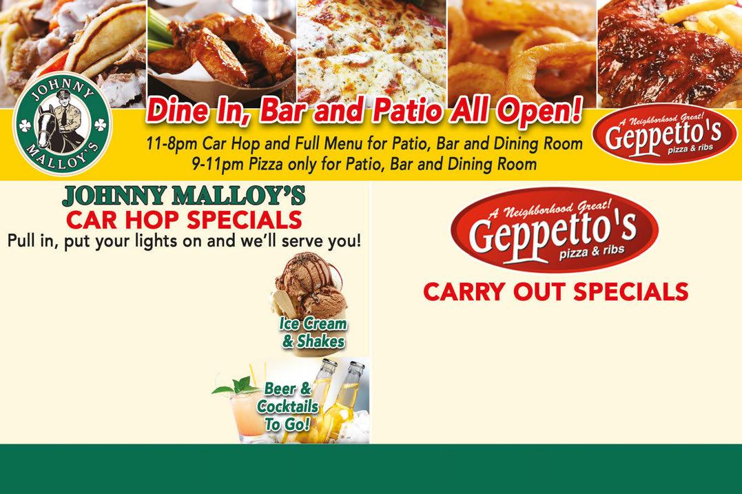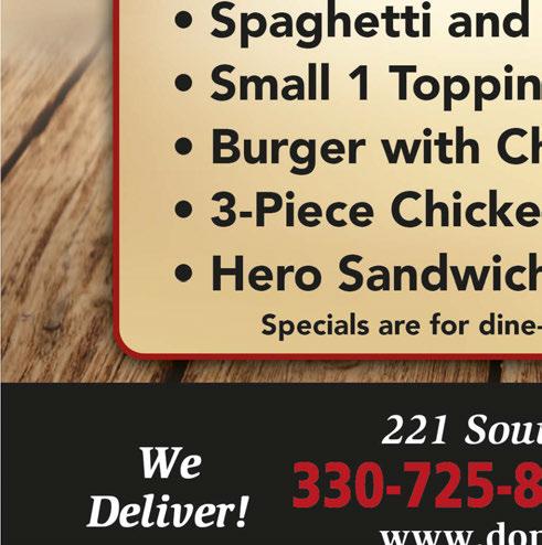 1038 N. Court St., Medina • 330-723-4100 Please place your orders online through:johnnymalloysmedina.com • geppettos.com • door dash • grub hub • slice • uber eats Buy One Large or Medium Pizza at Regular Price & Get a Second Pizza For $4.00 Must be equal or leser value. Expires 8/13/20. 15 Wings For $14.99 Expires 8/13/20. Family Pack of Ribs $39.99 Expires 8/13/20. MONDAY - $5 Gyro TUESDAY - 2 For $6 Chicken Sandwiches WEDNESDAY - 55¢ Wings THURSDAY - Large Pizza up to 5 Toppings $10 FRIDAY - Large 3 Topping Pizza + 10 Wings $20 SATURDAY - $5 Burger and French Fries SUNDAY - 1/2 Slab Ribs & Fries $10 or Full Slab Ala Carte $15 $$ $$ $$ $$ $$ $$ $$ $$ $$ $$ $$ $$ $$ $$ $$ $$ Buy One Game of Mini Golf Get One FREE Not valid with other offers. Expires 10/31/20. Some restrictions may apply. Valid Friday - Sunday Not valid with other offers. Expires 9/2720. Some restrictions may apply. ALL PLAY PASS (Play All Day) Save $10 Per Person Valid Monday-Thursday Not valid with other offers. Expires 8/13/20. Some restrictions may apply. ALL PLAY PASS (Play All Day) Buy One Get One Free Valid when golf is open. 1 small popcorn free for every 2 games of mini golf purchased at regular price. Not valid with other offers. Expires 10/31/20. FREE POPCORN with purchase of 2 games of mini golf TMS-M TMS-M TMS-M TMS-M