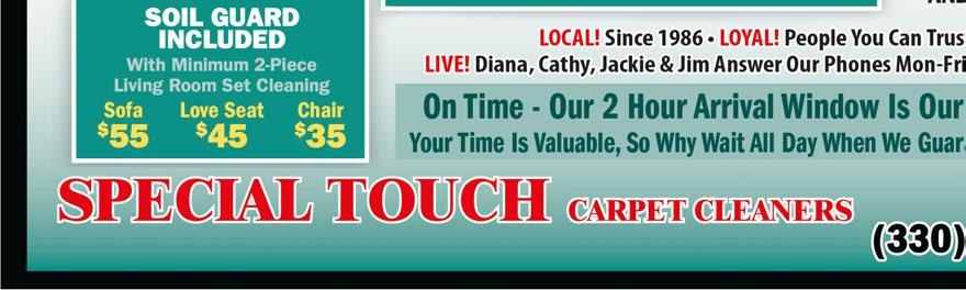 GARAGE DOOR REPAIR & INSTALL CALL TODAY! 330.265.0336 24/7 SERVICE! NO CHARGE FOR NIGHT CALLS! FREE SERVICE CALL WITH ANY REPAIR OVER $100 FREE GARAGE DOOR OPENER WITH NEW DOOR PURCHASE Must present coupon at time of repair. Expires 8/15/20 Expires 8/15/20 Expires 8/15/20 Call for Details. Expires 8/15/20 $50 OFF *ANY NEW 1-CAR GARAGE DOOR $100 OFF *ANY NEW 2-CAR GARAGE DOOR OR $50 OFF 10% OFF $39500 LIFTMASTER 1/2 HORSEPOWER ELECTRIC GARAGE DOOR OPENER ONE HIGH-CYCLE SPRING WITH PURCHASE OF ONE HIGH CYCLE SPRING AT REGULAR PRICE ANY GARAGE DOOR REPAIR Must present coupon at time of repair. Expires 8/15/20 Must present coupon at time of repair. Expires 8/15/20 INSTALLED. WITH TWO-CAR TRANSMITTERS & A KEYLESS ENTRY. ONLY WE BRING THE STORE TO YOUR DOOR CALL US TODAY 330.806.5499 LUXURY VINYL • CARPET • HARDWOOD • TILE • LAMINATE • INSTALLATION 50% OFF GET UP TO $500 OFF $1000 OFF FREE ANY CARPET OR FLOORING PURCHASE OF $1800 OR MORE. MUST PRESENT COUPON. NOT VALID WITH ANY OTHER OFFER. MAY NO T BE APPLIED TO PREVIOUS PURCHASES. EXPIRES 8/15/20 MUST PRESENT COUPON. NOT VALID WITH ANY OTHER OFFER. MAY NO T BE APPLIED TO PREVIOUS PURCHASES. EXPIRES 8/15/20 ANY CARPET OR FLOORING PURCHASE OF $3600 OR MORE. IN-HOME ESTIMATES
