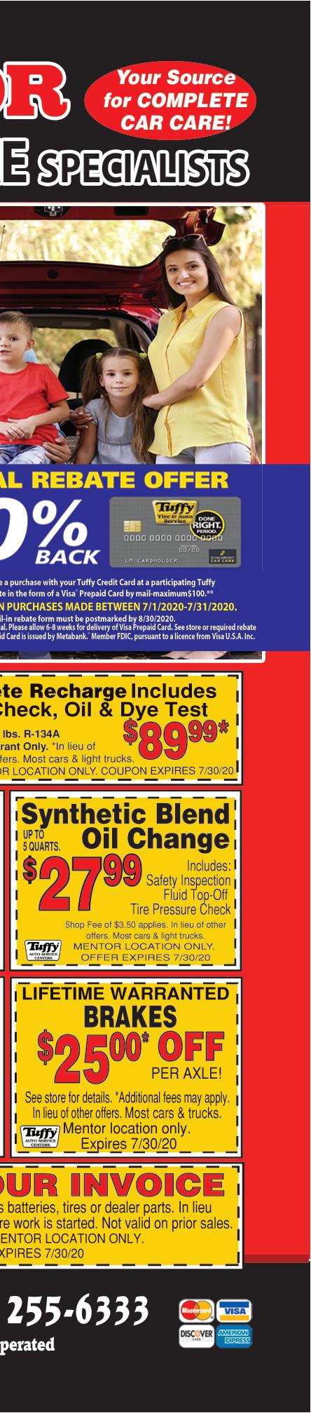 SHOP LOCALLY $$$ SAVE LOCALLY™ • VISIT www.TownMoneySaver.com FOR MORE COUPON SAVINGS! Largest Stocking Dealer in Lake, Geauga & Ashtabula Counties • M-THR: 8-6 • FRI: 8-5 • SAT: 8-2 • SUN: CLOSED CUSTOM MADE AREA RUGS! LET US MAKE YOUR ROOM UNIQUE AS YOU WITH A BEAUTIFUL CUSTOM MADE RUG! 4520 Beidler Rd • Willoughby 440-953-3567 DIRECT FROM MILL... DEEP DISCOUNTS ON CARPET, VINYL LAMIATE, WOOD & TILE! THREE-ROOM SPECIAL $749 Plush Carpeting • 5 to Choose From Valid for 3 Rooms up to 144 sq.ft. each CARPET PADDING INSTALLATION CARPET & FLOORING MILL OUTLET WITH COUPON. NOT VALID WITH OTHER OFFERS. EXPIRES 7/30/20 DREAM WEAVER GLORY AVAILABLE IN 24 COLORS! $2899/per yard (3.23 per sq. ft.) Price Includes: Carpet, 8lb. Pad & Professional Installation AVAILABLE FOR IMMEDIATE INSTALLATION! $3399/per yard (3.78 per sq. ft.) 75 oz. MOHAWK PATRIOT Everstrand Continuum STAIN, SOIL & PET URINE RESISTANCE Anti-Static 12 Colors! 70 oz. SILKY SOFT CARPET SEVEN WONDERFUL COLORS! $3699/per yard (4.11 per sq. ft.) CARPET & FLOORING MILL OUTLET WITH COUPON. NOT VALID WITH OTHER OFFERS. EXPIRES 7/30/20 Price Includes: Carpet, 8lb. Pad & Professional Installation AVAILABLE FOR IMMEDIATE INSTALLATION! CARPET & FLOORING MILL OUTLET WITH COUPON. NOT VALID WITH OTHER OFFERS. EXPIRES 7/30/20 Price Includes: Carpet, 8lb. Pad & Professional Installation AVAILABLE FOR IMMEDIATE INSTALLATION! CARPET & FLOORING MILL OUTLET WITH COUPON. NOT VALID WITH OTHER OFFERS. EXPIRES 7/30/20 CLICK LVT VINYL PLANK $2.19/sq. ft. Starting at CARPET & FLOORING MILL OUTLET WITH COUPON. NOT VALID WITH OTHER OFFERS. EXPIRES 7/30/20 MANY PATTERNS IN STOCK! ABSOLUTE BEST PRICE ON COREtec! ALL IN-STOCK! COREtec One..................$3.79sq.ft. COREtec Plus..................$3.99sq.ft. COREtec Plus XL............$5.12sq.ft. COREtec Plus HD............$5.29sq.ft. COREtec Plus Design...$5.29sq.ft. COREtec Plus XLE.........$4.99sq.ft. CARPET & FLOORING MILL OUTLET WITH COUPON. NOT VALID WITH OTHER OFFERS. EXPIRES 7/30/20 WWWWWWWW NEXT DAY INSTALLATION AVAILABLE ON IN-STOCK ITEMS “Our Prices and Selection will FLOOR You!” WWWWWWWW 7488 Mentor Avenue Mentor • 440-946-3995 4839 Robinhood Dr. Willoughby • 440-946-9393 Mon-Sat: 10:30am - 9pm / Sunday 11am - 8pm Mon-Thur: 10:30am-9pm / Fri & Sat: 10:30am-10pm / Sunday 11am - 8pm FAMILY PACK NO LIMIT! NO LIMIT! NO LIMIT! Sunday Only! Extra for BTE. Valid only at 7488 Mentor Ave. & 4839 Robinhood Dr. Not valid with any other offers, online ordering or delivery. EXPIRES 7-30-20 Any 10” Sandwich $4.75 Any 7” Sandwich $18 Any 4 7” Sandwiches $6.75 4- Sandwiches 4- Reg. Potato Waffers® 2- Liter of Pepsi® 7” .......$28.99 +tax 10” .....$32.99 +tax NO LIMIT! NO LIMIT! NO LIMIT! Extra for BTE. Valid only at 7488 Mentor Ave. & 4839 Robinhood Dr. Not valid with any other offers, online ordering or delivery. EXPIRES 7-30-20 Extra for BTE. Valid only at 7488 Mentor Ave. & 4839 Robinhood Dr. Not valid with any other offers, online ordering or delivery. EXPIRES 7-30-20 Extra for BTE. Valid only at 7488 Mentor Ave. & 4839 Robinhood Dr. Not valid with any other offers, online ordering or delivery. EXPIRES 7-30-20 Extra for BTE. Valid only at 7488 Mentor Ave. & 4839 Robinhood Dr. Not valid with any other offers, online ordering or delivery. EXPIRES 7-30-20 NO LIMIT! Any 7” Meal Extra for BTE. Valid only at 7488 Mentor Ave. & 4839 Robinhood Dr. Not valid with any other offers, online ordering or delivery. EXPIRES 7-30-20 $6.99 7” Romanburger® OR 7” Hot Buttered Cheesesteak™ $4.25 MAKE IT A MEAL FOR JUST $2.90 + tax MORE! +tax MAKE IT A MEAL FOR JUST $2.90 + tax MORE! MAKE IT A MEAL FOR JUST $2.90 + tax MORE! Online ordering: mrhero.com