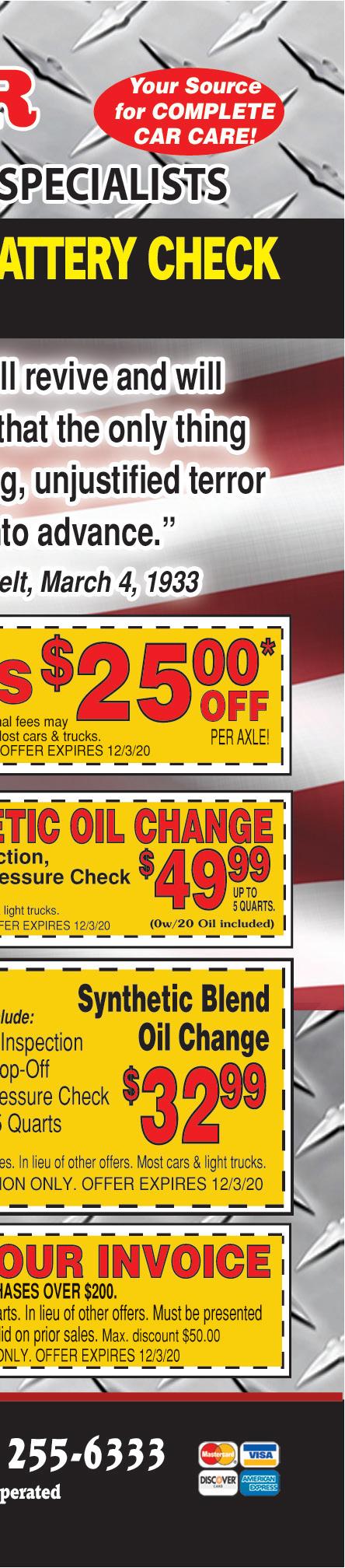 SHOP LOCALLY $$$ SAVE LOCALLY™ • VISIT www.TownMoneySaver.com FOR MORE COUPON SAVINGS! Letters from Santa Claus! For only $5 surprise that special child or adult with a letter from Santa Claus! Each letter will also include a coloring page & sticker sheet for your child. For each letter, please fill out coupon or reasonable facsimile. Hurry, all orders must be received by Dec. 15, 2020 to be delivered before Christmas. Mail check or money order payable to: Robin Kolar 5533 Heather Hill Drive Mentor, Ohio 44060 Name __________________________________________________________ Address _________________________________________________________ City ____________________________________________________________ State _____ Zip _______________ Person’s Age _______ q Boy q Girl Please send letter to: A gift the child id most likely to get this Christmas ______________________ HURRY! Order Yours Today! Imagine the look on their faces when they open the mail and find a letter marked “Special Delivery from the North Pole!” Largest Stocking Dealer in Lake, Geauga & Ashtabula Counties • M-FRI: 8-5 • SAT: 8-2 • SUN: CLOSED CUSTOM MADE AREA RUGS! LET US MAKE YOUR ROOM UNIQUE AS YOU WITH A BEAUTIFUL CUSTOM MADE RUG! 4520 Beidler Rd • Willoughby 440-953-3567 DIRECT FROM MILL... DEEP DISCOUNTS ON CARPET, VINYL LAMIATE, WOOD & TILE! THREE-ROOM SPECIAL $749 Plush Carpeting • 5 to Choose From Valid for 3 Rooms up to 144 sq.ft. each CARPET PADDING INSTALLATION CARPET & FLOORING MILL OUTLET WITH COUPON. NOT VALID WITH OTHER OFFERS. EXPIRES 12/3/20 DREAM WEAVER GLORY AVAILABLE IN 24 COLORS! $2899/per yard (3.23 per sq. ft.) Price Includes: Carpet, 8lb. Pad & Professional Installation AVAILABLE FOR IMMEDIATE INSTALLATION! $3399/per yard (3.78 per sq. ft.) 75 oz. MOHAWK PATRIOT Everstrand Continuum STAIN, SOIL & PET URINE RESISTANCE Anti-Static 12 Colors! 70 oz. SILKY SOFT CARPET SEVEN WONDERFUL COLORS! $3699/per yard (4.11 per sq. ft.) CARPET & FLOORING MILL OUTLET WITH COUPON. NOT VALID WITH OTHER OFFERS. EXPIRES 12/3/20 Price Includes: Carpet, 8lb. Pad & Professional Installation AVAILABLE FOR IMMEDIATE INSTALLATION! CARPET & FLOORING MILL OUTLET WITH COUPON. NOT VALID WITH OTHER OFFERS. EXPIRES 12/3/20 Price Includes: Carpet, 8lb. Pad & Professional Installation AVAILABLE FOR IMMEDIATE INSTALLATION! CARPET & FLOORING MILL OUTLET WITH COUPON. NOT VALID WITH OTHER OFFERS. EXPIRES 12/3/20 CLICK LVT VINYL PLANK $2.19/sq. ft. Starting at CARPET & FLOORING MILL OUTLET WITH COUPON. NOT VALID WITH OTHER OFFERS. EXPIRES 12/3/20 MANY PATTERNS IN STOCK! ABSOLUTE BEST PRICE ON COREtec! ALL IN-STOCK! COREtec One..................$4.09sq.ft. COREtec Plus..................$4.29sq.ft. COREtec Plus XL............$5.59sq.ft. COREtec Plus HD............$5.59sq.ft. COREtec Plus Design...$5.59sq.ft. COREtec Plus XLE.........$5.59sq.ft. CARPET & FLOORING MILL OUTLET WITH COUPON. NOT VALID WITH OTHER OFFERS. EXPIRES 12/3/20 “Our Prices and Selection will FLOOR You!” Immediate Installation for the Holidays!