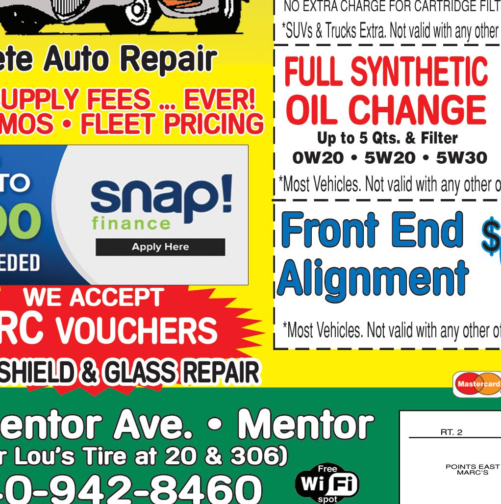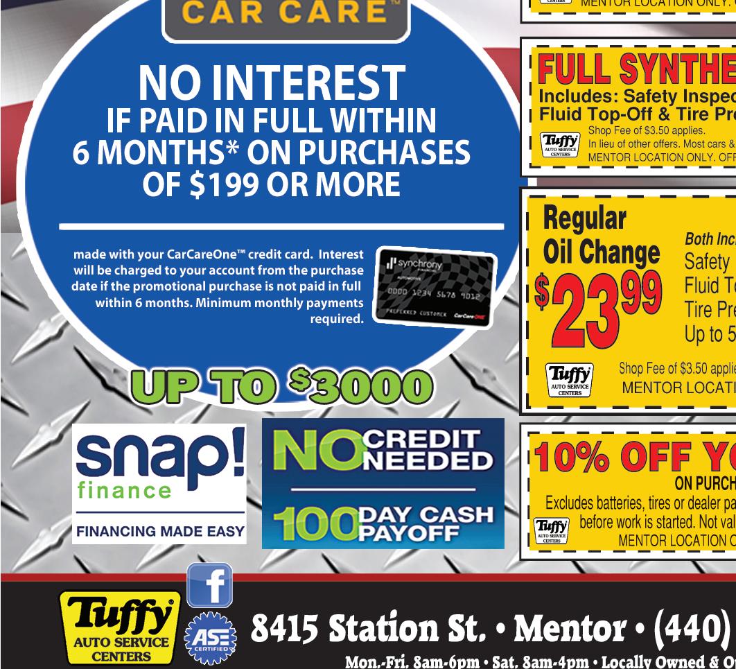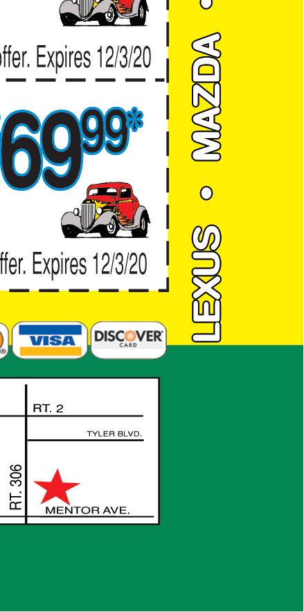 SHOP LOCALLY $$$ SAVE LOCALLY™ • VISIT www.TownMoneySaver.com FOR MORE COUPON SAVINGS! 7361 Center Street 440-290-8300 We are fortunate to make food for a living. It’s fun and rewarding to satisfy peoples’ taste for good pizza. We love Mentor and the people here. Thank you for the warm welcome. We look forward to cooking for you! Pizza • Subs • Wings Salads • Fries • Onion Rings Mozzarella Sticks • Desserts WE’RE OPEN! SEE OUR FULL MENU ON FACEBOOK CALL OR ORDER ONLINE: www.gliciouspizza.com Home of the Famous BIG DILL PICKLE PIZZA Open Mon-Fri 10a-6p • Sat 8a-12p 8720 Tyler Blvd. • 440-255-8468 • www.fastlanetruckoh.com Remote Starters Starting at $200 Internet Pricing WITHOUT the Shipping! SHOP LOCAL Tonneau Covers Starting at $300 Window Tint FREE Windshield Strip most vehicles We Install Seat Heaters! Your regular seats can be toasty warm this winter Winter Blows!