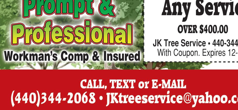 “PASTA FOR PUPPIES!” HAS BEEN RESCHEDULED FOR MONDAY, APRIL 12, 2021. BRING YOUR 2020 TICKET. CALL LINDE AT 440-951-2468 FOR MORE INFORMATION. “Quality Without Question” since 1987 • Plumbing New & Repairs • Sewer & Drain Cleaning • Video Inspection • Complete Bathroom Remodeling • Electric & Back-up Sump Pumps ® Mastercard ®VISA 8775 East Ave. • Mentor www.myplumberinc.com Dan Zappola OH LIC #27346 Any Complete Water Heater or Tane Water Commander Back-up Sump Pump With Coupon. Expires 12-3-20 Any Service Charge With Coupon. Expires 12-3-20 Any Bathtub or Shower Replacement With Coupon. Expires 12-3-20 $20 OFF $100 OFF $50 OFF 440-257-0061 440-946-1810 Residential • Commercial • Remodeling WE ARE ESSENTIAL & OPEN FOR BUSINESS LOCATED IN THE REAR OF THE MENTOR CITY CENTER EAST OF RT. 306 • ACROSS FROM GREAT LAKES MALL Local Discounts on Team Uniforms & Equipment Custom Lettering on T-Shirts, Sweatshirts & Other Apparel Little League Pants & Uniforms email:seasonalsportgds@aol.com www.seasonalsportinggoods.net SHOP LOCALLY & SAVE! 7667 MENTOR AVE. 440-942-9073 SEASONAL SPORTING GOODS High School Varsity Jackets!