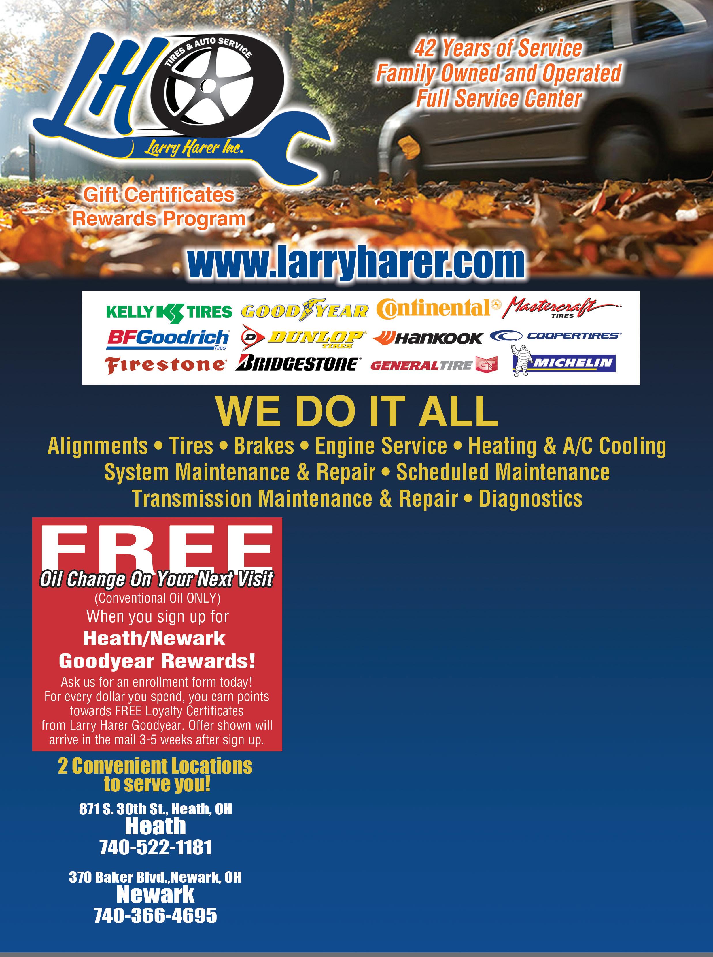 SLIDING SCALE DISCOUNTS On All Automotive Services $10 OFF on $100.00 - $199.99 $20 OFF on $200.00 - $299.99 $30 OFF on $300.00 - $399.99 $40 OFF on $500.00 plus MUST PRESENT COUPON AT TIME OF SERVICE. Not valid with any other offer or discount. 1 coupon per visit. Expires 10/30/20. Other restrictions apply. See store for details. Most Vehicles. MUST PRESENT COUPON AT TIME OF SERVICE. Expires 10/30/20. FALL MAINTENANCE PACKAGE • Lube, Oil & Filter Service (up to 5 qts. of Valvoline all-climate oil) • 26 pt. Preventative Maintenance Inspection • Battery, Starting & Charging System Test $3495 Other restrictions apply. See store for details. Most Vehicles. Expires 10/30/20. MUST PRESENT COUPON AT TIME OF SERVICE. Larry Harer Larry Harer Larry Harer Oil Change $24 95 OR $10 OFF Premium Oil Change Lube where applicable. New oil filter installed. Up to 5 Qts. brand oil.1 • Four Tire Rotation & Tire Inspection • Top Off Under Hood Fluid Levels • Inspect Belts & Hoses • Brake Inspection • Ask For Free A/C Inspection FREE FALL COURTESY INSPECTION