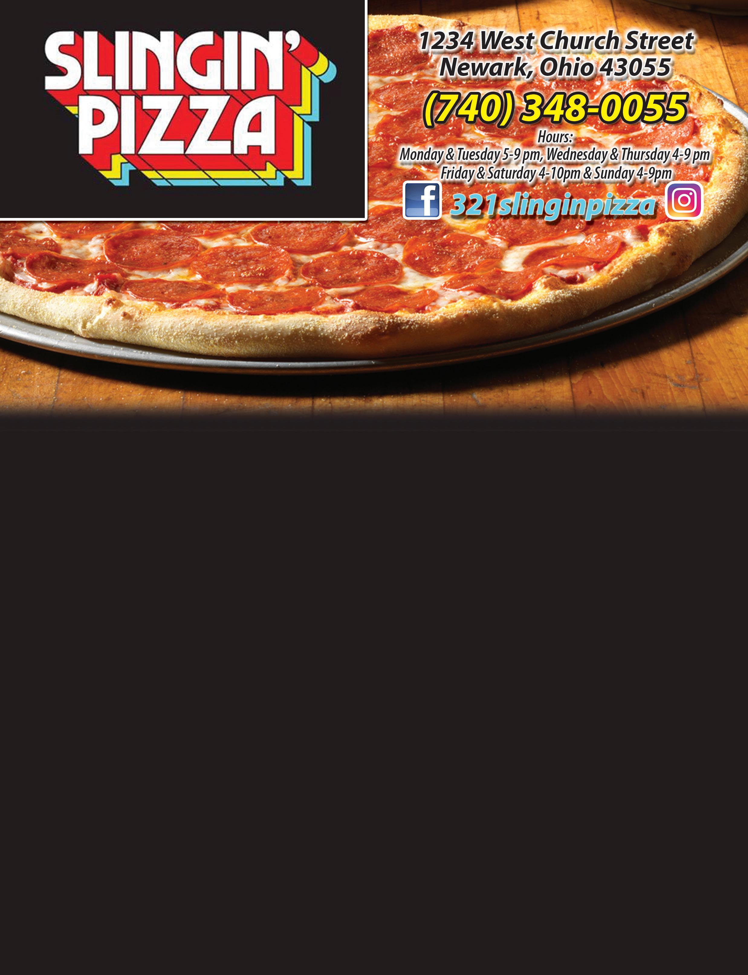$13.30 $2 OFF Any 12 inch Pizza $20.00 2 - 14 inch 1-Topping Pizzas Buy any Sub Get a Second Sub 1/2 OFF (of equal or lesser value) 1 coupon per customer. Must present coupon. Not valid with any other special or discount. Expires 10/30/20. 1 coupon per customer. Must present coupon. Not valid with any other special or discount. Expires 10/30/20. 1 coupon per customer. Must present coupon. Not valid with any other special or discount. Expires 10/30/20. WE NOW OFFER ONLINE ORDERING VISIT SLINGINPIZZAS.COM