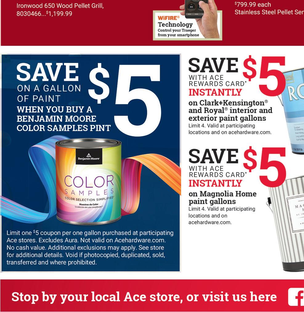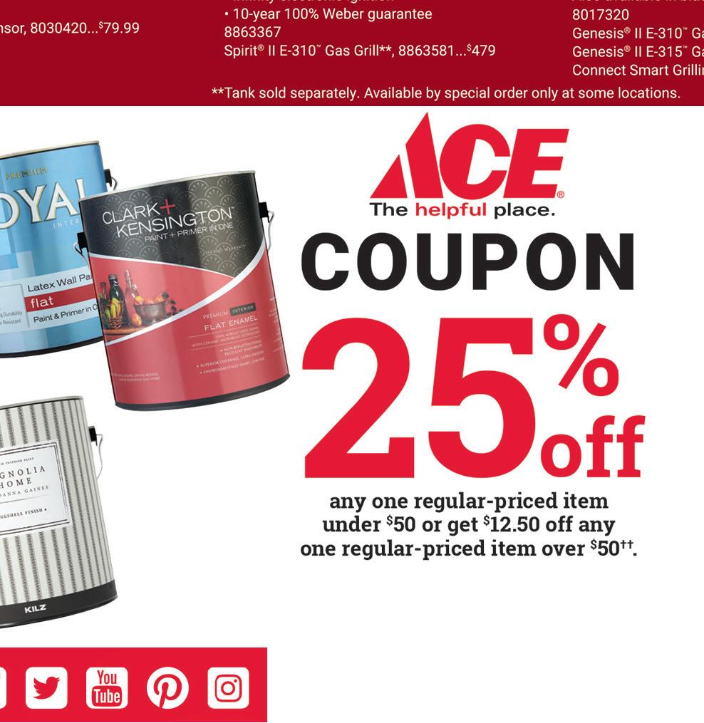 Limit 1 per customer. Valid for one transaction ony. Coupon good only at participating Ace Hardware stores July 1 through July 13, 2020. Must present coupon in store to receive offer. Not valid on acehardware.com. Discount does not apply to phone orders, special orders, or store charge accounts. In-store stock only. Discount not valid on sale, discounted and clearance-priced merchandise, rental, in-store services, Ace gift cards, city stickers, city/municipality required lawn/trash bags and garbage tags, lumber and building materials, fuel, pet food, previously purchased merchandise, Benjamin Moore®, Magnolia Homes by Joanna Gaines paint, Weber® branded products, EGO™ branded products, Nest branded products, STIHL branded products, Toro® branded products including select power tools and power equipment, YETI® branded products, Traeger® branded products, Big Green Egg® branded products, water heaters, grills and other items that each participating store may designate, or in conjunction with any other coupon, excluding Rewards. Additional exclusions may apply. See store for details. Offer good in USA except where prohibited or otherwise restricted by law. Void if copied, transferred, sold and where prohibited. Maximum discount is $12.50. No cash value.