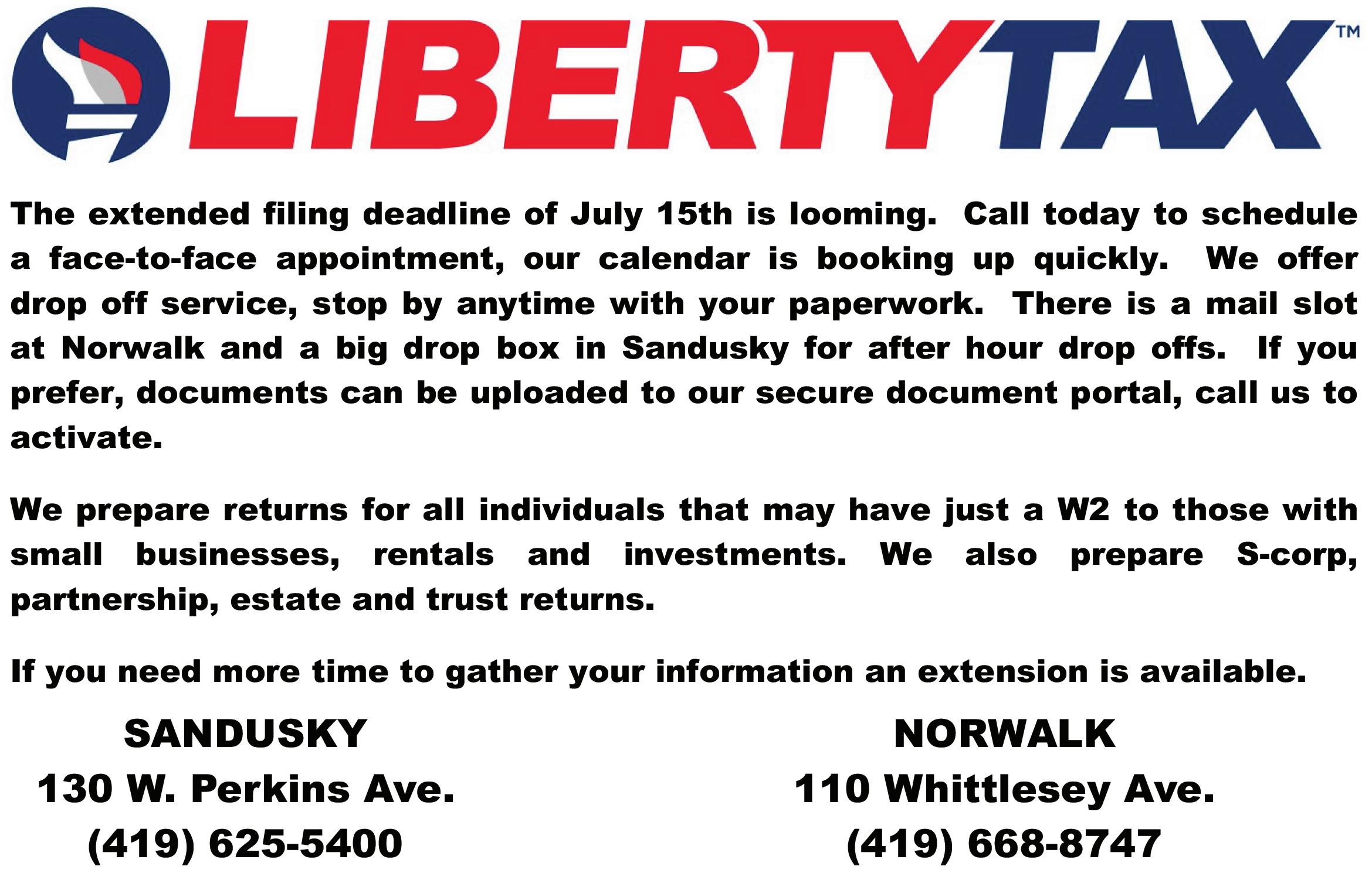 benefit. OPEN ALL YEAR! 419-663-2950 • 800-700-8948 134 Cleveland Rd. (Rte. 20), Unit E (next to Driver’s Exam Center) Norwalk, Ohio BIusinesses ndividuals AND Why Pay Big Dollars to have your refund in 2 days when you can have it direct deposited in 7-10 days for no extra cost? Keep your hard-earned money! 8-5 Monday-Friday Evening & weekend appointments available