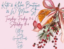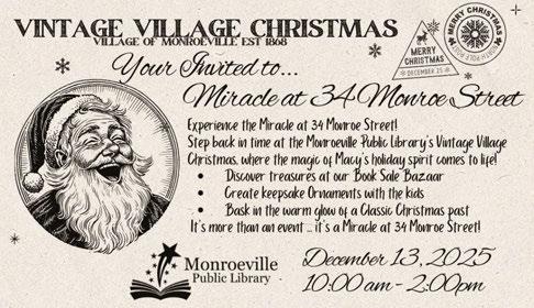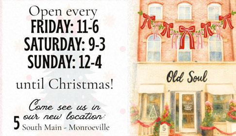 HAPPY HOLIDAYS FROM THE VILLAGE BARN! Keep our climate-controlled, handicap accessible event venue in mind when booking your upcoming event. Check us out at the-villagebarn.com. 18 S. Main St., Ste. A • Monroeville Hours: Friday 12-5 • Saturday 10-2 See Facebook for extended holiday hours!