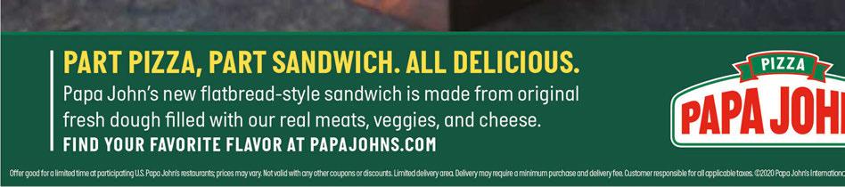 Sandusky 120 E. Perkins Ave. 419 609-9444 ‘Til 3pm weekdays. Carry-out only. Not valid with other offers. Good at participating restaurants. Limited delivery area; charges may apply. Customer responsible for all applicable taxes. Expires 07-15-20. 1 Small 2-Topping Pizza $500 Carryout Only PROMO CODE=Small5 with Drink=Small6 Papa Rewards Points=5 or 6 Not valid with other offers. Good at participating restaurants. Limited delivery area; charges may apply. Customer responsible for all applicable taxes. Expires 07-15-20. Poppers & Pizza Special • Lunch • Special • Lunch • Special Your Choice! Not valid with other offers. Good at participating restaurants. Limited delivery area; charges may apply. Customer responsible for all applicable taxes. Expires 07-15-20. Order 1 Large Build-Your-Own —or— Any Specialty Pizza $1200 PROMO CODE=Largeany12 Papa Rewards Points=12 — Locally Owned & Operated — PAPAJOHNS.COM Now hiring drivers. Stop in and apply! Try our NEW Jalapeño Popper Rolls & a Large 1-Topping Pizza for just $12.99! ‘Til 3pm weekdays. Carry-out only. Not valid with other offers. Good at participating restaurants. Limited delivery area; charges may apply. Customer responsible for all applicable taxes. Expires 07-15-20. Add a 20 oz. Drink for just $1.00! 1 Medium 1-Topping Pizza $600 Carryout Only PROMO CODE=Medco6 Papa Rewards Points=6 Pizza & Wings! Not valid with other offers. Good at participating restaurants. Limited delivery area; charges may apply. Customer responsible for all applicable taxes. Expires 07-15-20. $1600 Papa Rewards Points=16 PROMO CODE lgwings16 1 Large up to 2-Toppings Pizza & 8-piece Wings Specialty Bundle Not valid with other offers. Good at participating restaurants. Limited delivery area; charges may apply. Customer responsible for all applicable taxes. Expires 07-15-20. $1999 Papa Rewards Points=19 The Works or any Large Specialty Pizza, Breadsticks, & a 2-liter Order on the “Specials” page at papajohns.com Papa Rewards Points=12 PROMO CODE jalapeno1299 ‘til July 15th