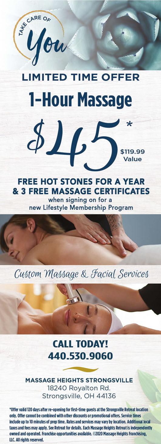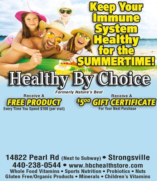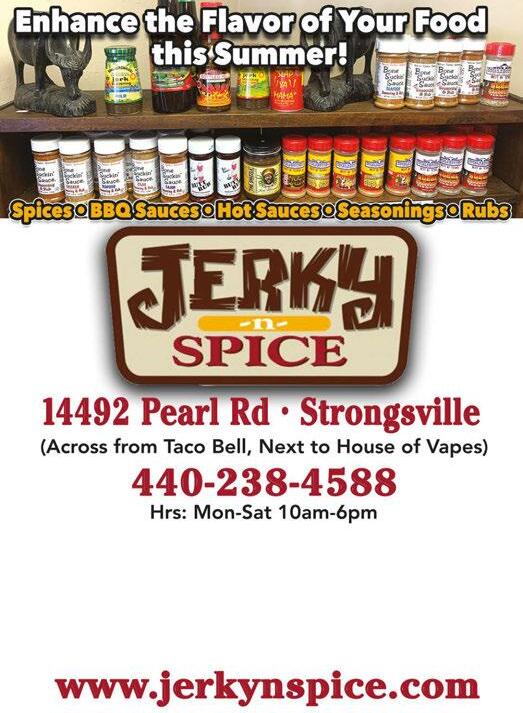 PEARL ROAD AT SHURMER www.shopstrongsville.com Shurmer Rd. BE OUR NEXT SUCCESS STORY! Leasing Info 216-292-3700 Your Resale Headquarters Munchkins’ Kloset 440-238-9464 www.harvestsaloon.com Chiropractic, Massage, Fitness and Zumba all under one roof! The Healthiest You Chiropractic Center Present this coupon for a n no o charge e consultation, , exam m and d fitness s assessment (Up to $340.00 Value) 440-238-3338 www.crossfitstrongsville.com www.thychiro.com Where Adorable Meets Affordable Check us out on Facebook Munchkins’ Kloset Buys And Sells The Best Things Kids Outgrow! Mon-Sat: 9am - 8pm, Sun: Noon - 5pm 15205 Pearl Road • 440-572-6000 LIVE ENTERTAINMENT EVERY FRI & SAT @9PM When you shop at Plato’s Closet this summer, you won’t get burned on prices. Get gently used shorts, tanks, tees, sandals and other summer essentials. 440-878-5085 Gourmé Deli & Restaurant 15315 Pearl Rd. (Corner of Shurmer & Pearl) Mon-Sat 6:30am-9pm Sunday 6:30am-3pm 440-572-3111 FREE WI FI AVAILABLE Breakfast Specials $3.49 Lunch $6.99 (INCLUDES SOUP & SALAD) COME ENJOY DINING ON THE BEST PATIO! 440-238-8300 RESALEDONE RIGHT NOW BUYING DESIGNER HANDBAGS FOR CASH ON THE SPOT! For All Women Sizes 0-26 & Maternity! Stop into Maggie & Ellie’s Pottery and Art Studio, the area’s only paint-your-own pottery, glass-fusing and now canvas painting studio. No appointments needed 15155 Pearl Rd., Strongsville 440-268-6689 www.maggieandellies.com $5 OFF A $25 PURCHASE Cannot be combined with any other offer or discount. Expires 8/31/20 facebook.com/maggieandellies • instagram.com/maggieandellies
