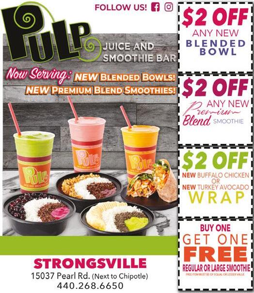 STRONGSVILLE Shop locally. Save locally. July 2020 Smoothies, Healthy Wraps, Salads, Fresh Fruit and Vegetable Juice, Nutritious Wheatgrass! Valid at Strongsville location only. One coupon per customer per visit. Offers cannot be combined. Must present coupon at time of purchase. Expires 8-15-2020 Valid at Strongsville location only. One coupon per customer per visit. Offers cannot be combined. Must present coupon at time of purchase. Expires 8-15-2020 Not valid on Premium Smoothies. Valid at Strongsville location only. One coupon per customer per visit. Offers cannot be combined. Must present coupon at time of purchase. Expires 8-15-2020 Valid at Strongsville location only. One coupon per customer per visit. Offers cannot be combined. Must present coupon at time of purchase. Expires 8-15-2020 PULPJUICEANDSMOOTHIE.COM (440)268-8606 Strongsville,OH44136 13433PearlRd Strongsville 08/09/20 NothingBundtCakes.com Not Valid with Any Other Offer. Must Present Coupon at time of order. Expires 8-13-20 2 Piece Suits $1299 COMFORTERS Any Size (down extra) $2299 ALL DRY CLEANING DONE ON PREMISES Not Valid with Any Other Offer. Must Present Coupon at time of order. Expires 8-13-20 Not Valid with Any Other Offer. Must Present Coupon at time of order. Expires 8-13-20 $500 OFF Your Next Dry Cleaning Order of $25 or More (Excludes Shirts) Not Valid with Any Other Offer. Must Present Coupon at time of order. Expires 8-13-20 20% OFF Winter Coats 14312 Pearl Road Strongsville (Across from Pat Catan’s) 440-572-0233 25% OFF Any Purchase One coupon per customer. Not valid with any other offer. Some restrictions apply. Expires 8/13/20. S 25% OFF Any Purchase One coupon per customer. Not valid with any other offer. Some restrictions apply. Expires 8/13/20. S