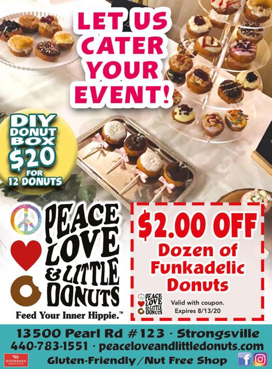 LOCALLY RAISED BEEF, PORK & CHICKEN AVAILABLE Scoop-able Cat Litter 40lb $10.99 Value Blend Bird Seed 50lb $15.99 Farm Fresh Cage Free Eggs BUY ONE DOZEN GET ONE FREE Buy 6 Donuts & Get 3 FREE With coupon. Expires 8-13-20 $1.00 OFF Any One Dozen Donuts With coupon. Expires 8-13-20 FREE Donut with a coffee purchase With coupon. Expires 8-13-20 15033 Pearl Rd 440-238-0288 Open 24 Hours Everyday