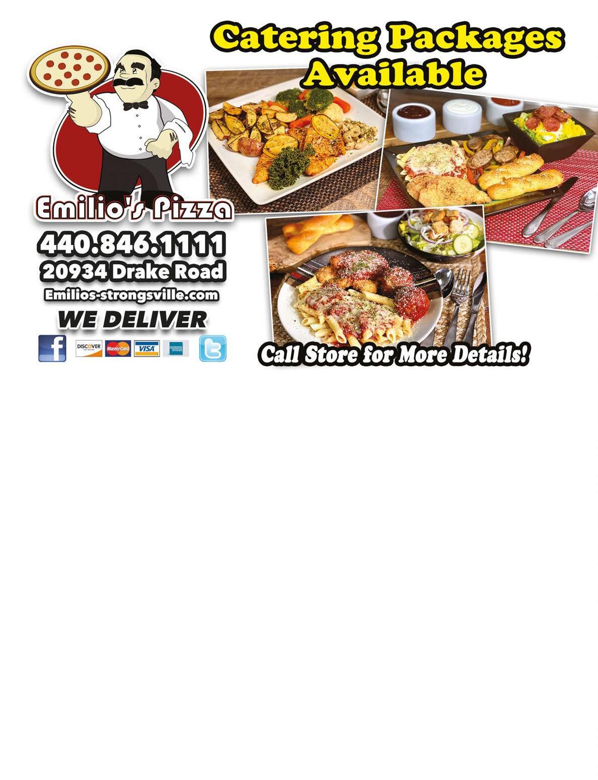 Mini Party Pack 1 Half Sheet (24 cut) 1-Topping Pizza, Half Tray of Garden Salad w/Dressing, 30 Wings & Half Tray of Rigatoni Emilio’s Exclusive Offer. Cannot be combined with any other offer. Expires 8-13-20 Emilio’s Exclusive Offer. Cannot be combined with any other offer. Expires 8-13-20 $69.99$99.99 2 Half Sheet (48 cut) 1-Topping Pizzas, Full Tray of Chicken Tenders, Your Choice: Full Tray of Pasta Salad or Rigatoni with Marinara Sauce & Cheese 2 Half Sheet (48 cut) 1-Topping Pizzas, Full Tray of Garden Salad w/Dressing, 60 Wings & Full Tray of Rigatoni Emilio’s Exclusive Offer. Cannot be combined with any other offer. Expires 8-13-20 $135.99 EMILIO’S PIZZA EXCLUSIVE OFFER. CANNOT BE COMBINED WITH ANY SPECIALS. MUST PRESENT COUPON UPON PURCHASE. EXPIRES 8-13-20 2 XLARGE 2 TOPPING PIZZAS $26.99 EMILIO’S PIZZA EXCLUSIVE OFFER. CANNOT BE COMBINED WITH ANY SPECIALS. MUST PRESENT COUPON UPON PURCHASE. EXPIRES 8-13-20 2 HALF SHEET 1 TOPPING PIZZAS $29.99 EMILIO’S PIZZA EXCLUSIVE OFFER. CANNOT BE COMBINED WITH ANY SPECIALS. MUST PRESENT COUPON UPON PURCHASE. EXPIRES 8-13-20 1 XLARGE 1 TOPPING PIZZA + 10 WINGS $21.99 EMILIO’S PIZZA EXCLUSIVE OFFER. CANNOT BE COMBINED WITH ANY SPECIALS. MUST PRESENT COUPON UPON PURCHASE. EXPIRES 8-13-20 1 MEDIUM 3 TOPPING PIZZA $10.99 EMILIO’S PIZZA EXCLUSIVE OFFER. CANNOT BE COMBINED WITH ANY SPECIALS. MUST PRESENT COUPON UPON PURCHASE. EXPIRES 8-13-20 XLARGE 1 TOPPING PIZZA + LARGE GARDEN SALAD $19.99