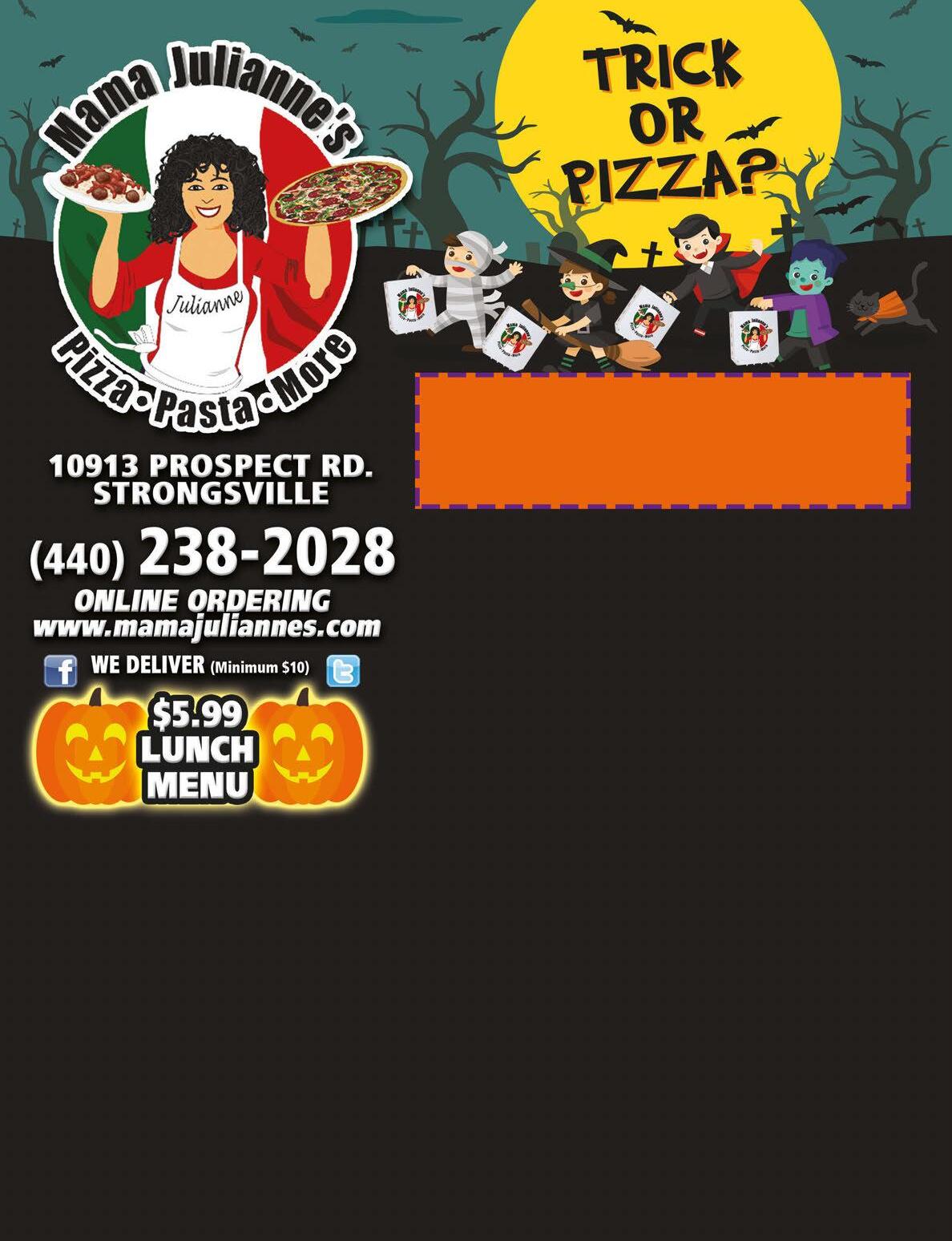 238-2028 • Mama Julianne’s NOT VALID WITH OTHER OFFERS ONLY WITH COUPON EXPIRES 11-12-20 12 PIECE CHICKEN WITH 16 JOJO’S $1799 ADD A PINT OF SLAW $2.00 HALF SHEET PIZZA WITH ONE TOPPING & 2 DOZEN WINGS $3499 238-2028 • Mama Julianne’s ADDITIONAL ITEMS EXTRA NOT VALID WITH OTHER OFFERS ONLY WITH COUPON EXPIRES 11-12-20 PIZZA & WING DEAL 1 MEDIUM 8-CUT PIZZA WITH TWO TOPPINGS $999 238-2028 • Mama Julianne’s ADDITIONAL ITEMS EXTRA NOT VALID WITH OTHER OFFERS ONLY WITH COUPON EXPIRES 11-12-20 Limit 2 1 JUMBO 12-CUT PIZZA WITH TWO TOPPINGS $1499 Specialty Pizzas Not Included 238-2028 • Mama Julianne’s ADDITIONAL ITEMS EXTRA NOT VALID WITH OTHER OFFERS ONLY WITH COUPON EXPIRES 11-12-20 Limit 2 SHEET PIZZA WITH ONE TOPPING, 24 PC BROASTED CHICKEN, 32 JOJO’S & A 2-LITER OF POP $6599 238-2028 • Mama Julianne’s ADDITIONAL ITEMS EXTRA . NOT VALID WITH OTHER OFFERS ONLY WITH COUPON • EXPIRES 11-12-20 1/2 SHEET CHEESE PIZZA $1299 (20 SLICES) 238-2028 • Mama Julianne’s ADDITIONAL ITEMS EXTRA NOT VALID WITH OTHER OFFERS ONLY WITH COUPON. EXPIRES 11-12-20 Now Taking Pre Orders For Halloween 238-2028 • Mama Julianne’s ADDITIONAL ITEMS EXTRA . NOT VALID WITH OTHER OFFERS ONLY WITH COUPON • EXPIRES 11-12-20 PARTY PACK DEAL #1 SHEET PIZZA WITH ONE TOPPING, 32 PC BROASTED CHICKEN, 1/2 TRAY OF SALAD & 1/2 TRAY OF PASTA $10499 SERVES 12 -15 PARTY PACK DEAL #2