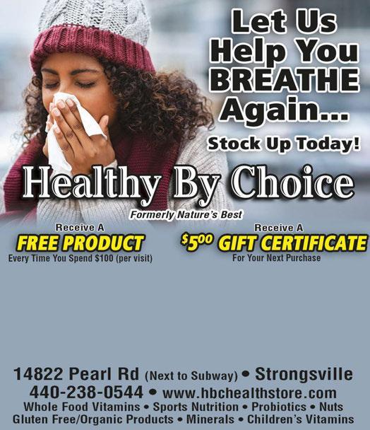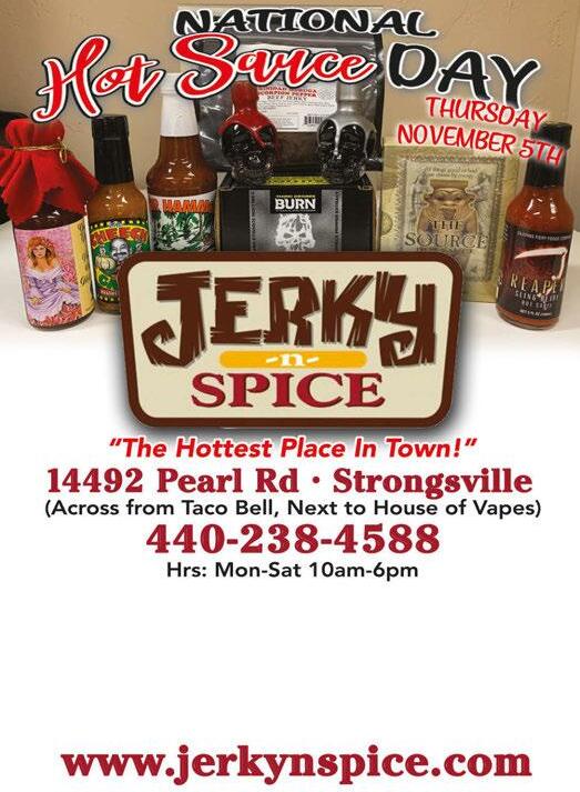 440-238-7543 20720 Westwood Drive www.weberandson.com Hrs: M-F 9am-5pm 52 years in Strongsville FREE Pick-Up & Delivery with repairs Limited Delivery Area Not valid with any other offer. Valid with coupon. Expires 10/30/20 Basic Snowblower Tune-Up $7295 Includes: • New Spark Plugs • Test Ignition System • Change Oil • Check Starter System • Clean Tank & Carb • Check All Belts & Pullies Not valid with any other offer. Valid with coupon. Expires 11/15/20 Plus tax & extra parts Save $22 Basic Snowblower Call for Additional Savings on Power Snowblowers Serving Liquor 7 Days a Week! Dine-In/Carryout Prepared Fresh Daily FREE WIFI Gift Certificates Available $400 OFF Any Purchase of $20 or More (Tax Not Included) Dine In or Carry Out. Valid at all locations listed. One coupon per table per party. Not valid w/any other offers or special of the day. Not valid on alcohol. Exp 11-12-20 S S Same management as Don Ramon Strongsville 18737 Royalton Rd.440-846-2313 S Gran Fiesta Mex Strongsville $600 OFF Any Purchase of $30 or More (Tax Not Included) Dine In or Carry Out. Valid at all locations listed. One coupon per table per party. Not valid w/any other offers or special of the day. Not valid on alcohol. Exp 11-12-20 $1000 OFF Any Purchase of $50 or More (Tax Not Included) Dine In or Carry Out. Valid at all locations listed. One coupon per table per party. Not valid w/any other offers or special of the day. Not valid on alcohol. Exp 11-12-20 FREE Fried Ice Cream 25% OFF YOUR TOTAL BILL All Day Long Not to be combined with any other offer or coupon CELEBRATING HALF WAY TO THURSDAY, NOVEMBER 5TH Saturday, Oct. 17th (With Purchase of 2 Dinner Entrees. Must Mention Ad) NEW ONLINE ORDERING NEW DELIVERY Visit donramon-granfiestamex.com for other locations & menu Visit donramon-granfiestamex.com for other locations & menu Go To donramon-granfiestamex.com & Select Delivery or Pick-Up $5 OFF With coupon. Expires 11/12/20 With Purchase of $25 or More WIDE VARIETY OF HOT SAUCES TO CHOOSE FROM! UP TO 7.1SCOVILLEMILLION UNITS! It’s not to early to think about Christmas gifts!