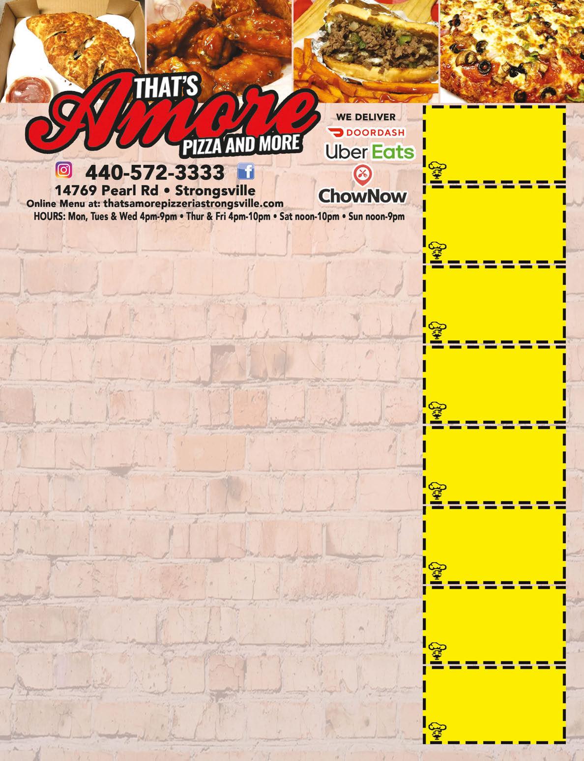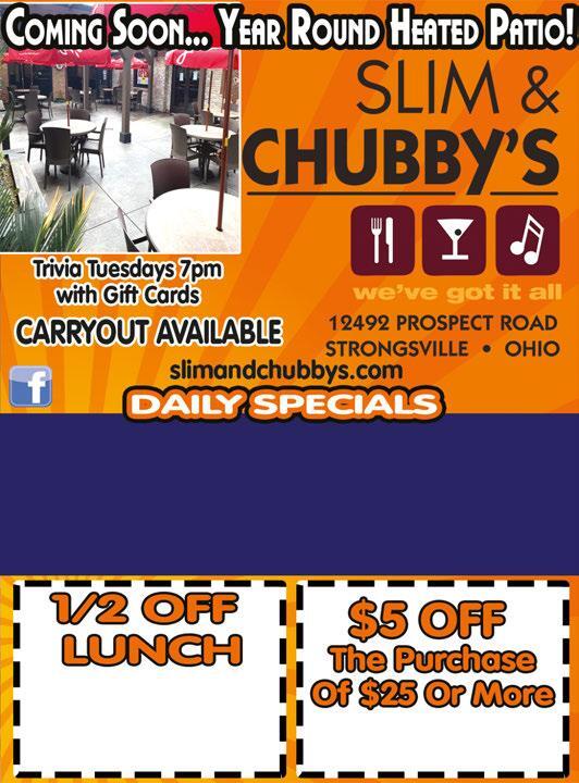 MONDAYS $0.69 Regular Wngs $0.59 Boneless Wings (Dine in only) $10.25 Black Angus Steak Dinner $10.99 Homemade City Chicken TUESDAYS $7.00 Select Burgers (Dine in only) Homemade Stuffed Peppers *Some Specials are Dine In Only Prices subject to change WEDNESDAYS Wine WednesdayHalf Off Bottles & Glasses Chef’s Choice Special $10.25 Black Angus Steak Dinner THURSDAYS Taco Thursday $13.99 BBQ Ribs & Chicken $0.69 Reg Wings/$0.59 Boneless Wings (Dine in only) Homemade Chicken Paprikash FRIDAYS $16.25 Slow-Roasted Prime Rib Dinner Fresh Hand-Breaded Lake Erie Perch Dinner Fish & Pierogi Dinner Specials SATURDAYS Taco Saturday $15.25 Steak & Shrimp Dinner SUNDAYS Seafood Sunday: Cluster of Crab Legs $7 One Dozen Mussels $4 • Seafood Alfredo $12.99 $0.69 Reg Wings / $0.59 Boneless Wings (Dine in only) Buy One Lunch Entree Get The 2nd Of Equal Or Lesser Value 1/2 OFF Valid 11am to 4pm Not valid with $6 lunch special. Not valid on recurring weekly specials. Not valid with any other coupon. Expires 11/12/20. Valid 4pm til Close Not valid on recurring weekly specials. Not valid with any other coupon. Expires 11/12/20. FROZEN DRINKS STRONGSVILLE VACUUM, INC 15290 PEARL RD. AT SHURMER • WWW.STRONGSVILLEVACUUM.COM FAST & FREE 15 Point Vacuum Repair Inspection In 15 Minutes (Most Models) Valid with coupon. Expires 11-12-20 15290 Pearl Rd • Strongsville 238-8867 Authorized Dealership $50-100 OFF NEW ORECK VACUUMS New and Refurbished Vacuums Available • On-site service and maintenance! • Lowest prices on all the best brands! • Large selection of sweeper bags • Trade-ins accepted • Used vacuums available ...and more! www.strongsvillevacuum.com Strongsville Vacuum offers a ANNUAL FREE INSPECTION on all new vacuum sweepers purchased from us FREE Bags or Belts Buy 3 Packages & get 4th FREE Valid with coupon. Expires 11-12-20 Valid w/coupon. Not valid w/any other offer. Expires 11-12-20 NOT INCLUDING THE STEAK Valid w/coupon. Not valid w/any other offer. Expires 11-12-20 Valid w/coupon. Not valid w/any other offer. Expires 11-12-20