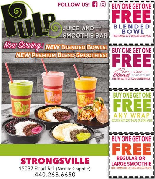 STRONGSVILLE Shop locally. Save locally. October 2020 Smoothies, Healthy Wraps, Salads, Fresh Fruit and Vegetable Juice, Nutritious Wheatgrass! Valid at Strongsville location only. One coupon per customer per visit. Offers cannot be combined. Must present coupon at time of purchase. Expires 11-15-2020 Not valid on Premium Smoothies. Valid at Strongsville location only. One coupon per customer per visit. Offers cannot be combined. Must present coupon at time of purchase. Expires 11-15-2020 Valid at Strongsville location only. One coupon per customer per visit. Offers cannot be combined. Must present coupon at time of purchase. Expires 11-15-2020 PULPJUICEANDSMOOTHIE.COM Valid at Strongsville location only. One coupon per customer per visit. Offers cannot be combined. Must present coupon at time of purchase. Expires 11-15-2020 (440)268-8606 Strongsville,OH44136 13433PearlRd Strongsville 11/07/20 NothingBundtCakes.com 25% OFF Any Purchase One coupon per customer. Not valid with any other offer. Some restrictions apply. Expires 11/12/20. S 25% OFF Any Purchase One coupon per customer. Not valid with any other offer. Some restrictions apply. Expires 11/12/20. S Fill with Gel $32 Gel Change $25 (Take Off Included) Over 1500+ Colors Pedicures $32 (Disposable Pedicure Liner, Nails Cut/File, Cuticle Trim, Callus Removal, Massage, Hot Towel & Polish) Dipping $37 (w/o Tips & Manicure) 1000+ Colors Full Set Acrylics with Gel Polish $40 Face Masks Clearance 3 for $10