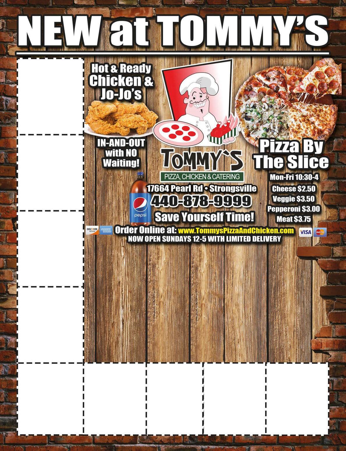 16pc. Chicken 50 Wings Full Sheet 1-Topping Pizza $7995 THE MINI PARTY PACK THE PARTY PACK 25pc. Chicken 50 Jo-Jo Potatoes Full Sheet 1-Topping Pizza 1/2 Pan of Salad (Dressing Not Included) 1/2 Pan of Rigatoni (Add 20 Meatballs for $10) $124.95 50pc. Chicken 75 Jo-Jo Potatoes Full Sheet 1-Topping Pizza Full Pan of Salad (Dressing Not Included) Full Pan of Rigatoni (Add 40 Meatballs for $20) $189.95 Please give us much notice as possible Crazy 8 • 8pc. Chicken • 8 Jo-Jo Potatoes • 8 oz Coleslaw • 4 Rolls w/Honey Butter $1699 Full Sheet 1-Topping plus 25 Pc Chicken $5995 add 50 JoJo’s for $14.99 THE SMALL PARTY PACK Cannot be combined with other coupons or lunch specials. 440-878-9999. Please mention when ordering. Expires 12/31/20 Large 16” 2-Topping Pizza $1599 440-878-9999. Please mention when ordering. Expires 12/31/20 440-878-9999. Please mention when ordering. Expires 12/31/20 440-878-9999. Please mention when ordering. Expires 12/31/20 440-878-9999. Please mention when ordering. Expires 12/31/20 440-878-9999. Please mention when ordering. Expires 12/31/20 440-878-9999. Please mention when ordering. Expires 12/31/20 440-878-9999. Please mention when ordering. Expires 12/31/20 440-878-9999. Please mention when ordering. Expires 12/31/20 Medium 2-Topping Pizza, 8pc. Chicken, 15 Jo-Jo Potatoes, 4 Rolls w/Homemade Honey Butter & Coleslaw $2999 PIZZA & CHICKEN COMBO 2 Medium 2-Topping Pizzas $1999 PIZZA & WING COMBO Medium 3-Topping Pizza Plus 10 Wings $2299 Pizza • Chicken • Ribs • Wings • Pasta • Potato Skins Fish & Shrimp • Subs • Burgers • Wraps • Pierogies Baked Lasagna • Soups • Calamari • Soft Pretzel • Veal Parm Keto Pizza • Smores • Stromboli • Calzone • Gluten Free Cauliflower Crust • Alfredo • Dairy Free Vegan Mozzarella Tommy’s Daily Lunch Specials Available Mon-Fri 10am-3pm Personal 6” 1-Topping Pizza Plus a small Garden Salad . . . . . . . . . . .$6 Soup + Salad . . . . . . . . . . . . . . . . . . . . . . .$7 Bowl of Soup & small Garden Salad 4pc. Chicken & 10 Jo-Jo Potatoes . . . . .$8 With Ranch & Coleslaw Spaghetti or Rigatoni with Meatballs or Lasagna, Salad, Garlic Toast . . . . . . . . . . . . . . . . . . . . . . . .$8 2 Slices of Pizza + a Can of Pop . . . .$6 + tax Any 7” Sub with Chips + Dip . . . . . . . . .$8 Red or White Calzone . . . . . . . . . . . . . . .$8 Up to three toppings 9” Small Pizza or KETO Pizza . . . . . . . .$8 Up to four toppings 3 Chicken Tenders . . . . . . . . . . . . . . . . . .$8 With Fries or Garden Salad 1/2 Sheet 2-Topping Pizza . . . . . . . . .$15.99