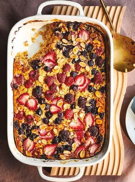Preheat the oven to 350°F. Spray a 9×9 inch square pan, or an 11×7 inch rectangle pan with nonstick spray. Any similar size pan that holds around 3 quarts works. Whisk all of the ingredients together in 1 large bowl. Pour into prepared baking pan. Top with nuts, if desired. Bake for 35 minutes or until the center appears *almost* set, which gives us a soft oatmeal. Cool for 5 minutes before serving. Spoon or slice and serve with yogurt, if desired. Cover leftovers tightly and refrigerate for up to 1 week.