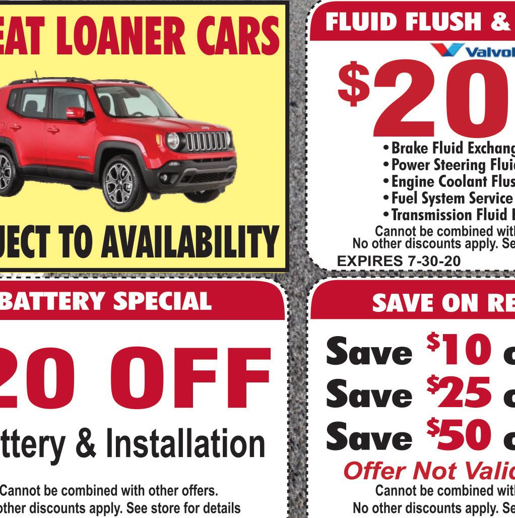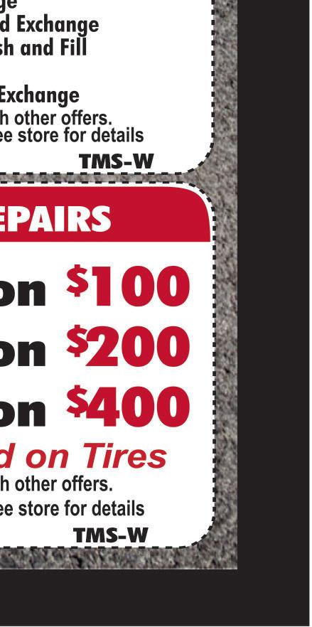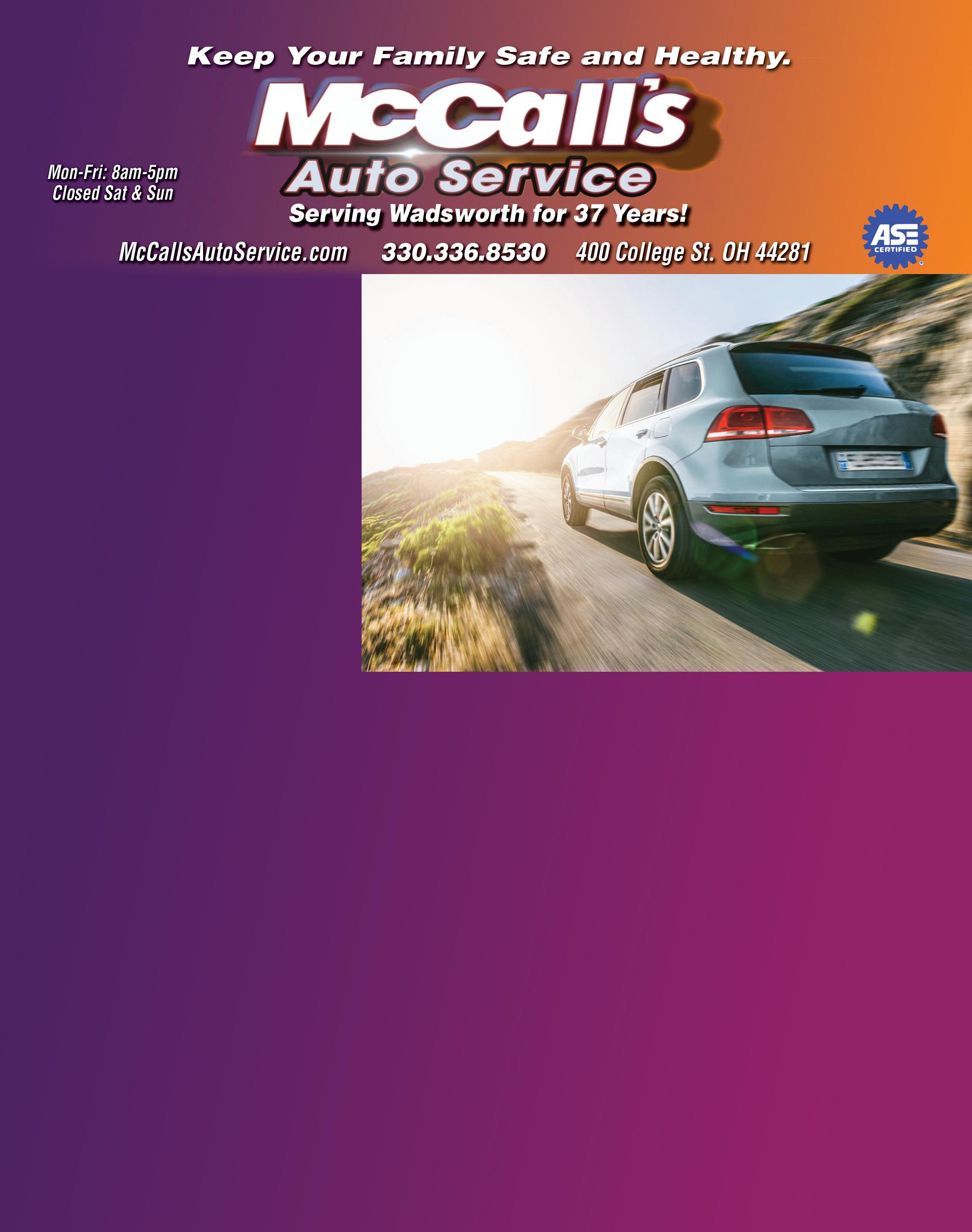 We can remove auto door dings & small dents keep your paint original maintaining your cars value & integrity, fast & affordable! Per Dent ($35 Thereafter) Paintless Dent Removal starting at ATTN: DIY GUY We Will Turn Your Brake Rotors $1200 Cooling System Flush $6995 (Within Wadsworth City Limits) each (Carry-In Only) With Coupon Only. Not valid with any other offer. McCall’s NAPA Auto Service. Please present coupon before service. Expires 7-31-20. With Coupon Only. Not valid with any other offer. McCall’s NAPA Auto Service. Please present coupon before service. Expires 7-31-20. $8595 With Coupon Only. Not valid with any other offer. McCall’s NAPA Auto Service. Please present coupon before service. Expires 7-31-20. With Coupon Only. Not valid with any other offer. McCall’s NAPA Auto Service. Please present coupon before service. Expires 7-31-20. Conventional OIL CHANGE & FILTER $2495 (up to 5qt oil) OIL CHANGE & FILTER OIL CHANGE & FILTER Full Synthetic Semi Synthetic Blend Excludes Diesels. With Coupon Only. Not valid with any other offer. McCall’s NAPA Auto Service. Please present coupon before service. Expires 7-31-20. PLUS FREE Tire Rotation $3495 (up to 5qt oil) Excludes Diesels. With Coupon Only. Not valid with any other offer. McCall’s NAPA Auto Service. Please present coupon before service. Expires 7-31-20. PLUS FREE Tire Rotation $4995 (up to 5qt oil) Excludes Diesels. With Coupon Only. Not valid with any other offer. McCall’s NAPA Auto Service. Please present coupon before service. Expires 7-31-20. PLUS FREE Tire Rotation FREE CHECK ENGINE LIGHT & CODES Diagnostic extra. With Coupon Only. Not valid with any other offer. McCall’s NAPA Auto Service. Please present coupon before service. Expires 7-31-20. FREE TOWING With Any Repair Over $100 AIR CONDITIONING Recharge Service $6995 Check condition of belts & line • Evacuate and recharge system with reclaimed refrigerant • Run system leak test • Check system performance With Coupon Only. Not valid with any other offer. McCall’s NAPA Auto Service. Please present coupon before service. Expires 7-31-20. Includes Freon Brake Special (Includes Free Tire Rotation) We will replace pads or shoes including machining rotors or drums and inspect and rotate your tires. $22500 per axle with OEM Factory Pads Foreign cars & trucks may be slightly higher. With Coupon Only. Not valid with any other offer. McCall’s NAPA Auto Service. Please present coupon before service. Expires 7-31-20.