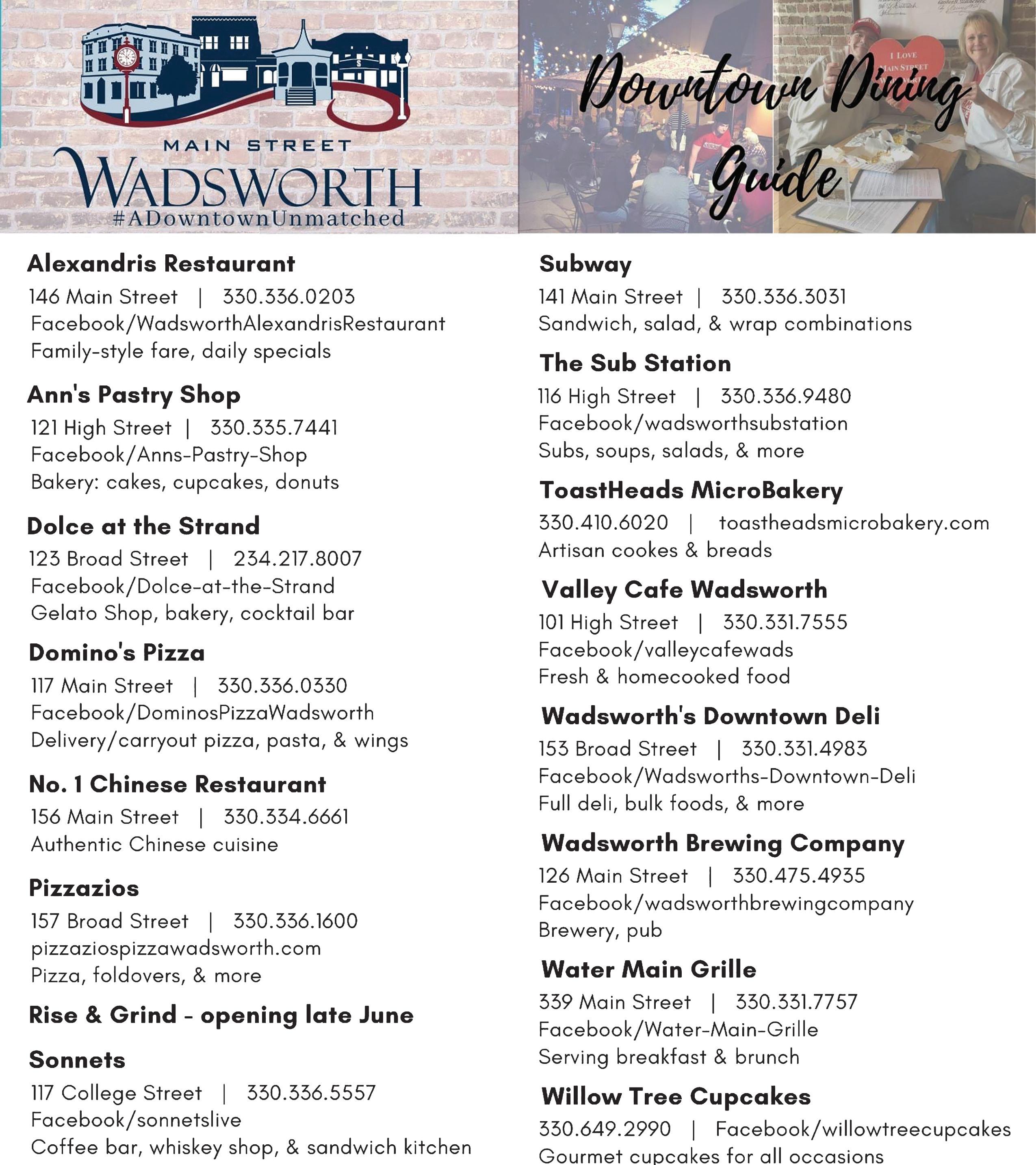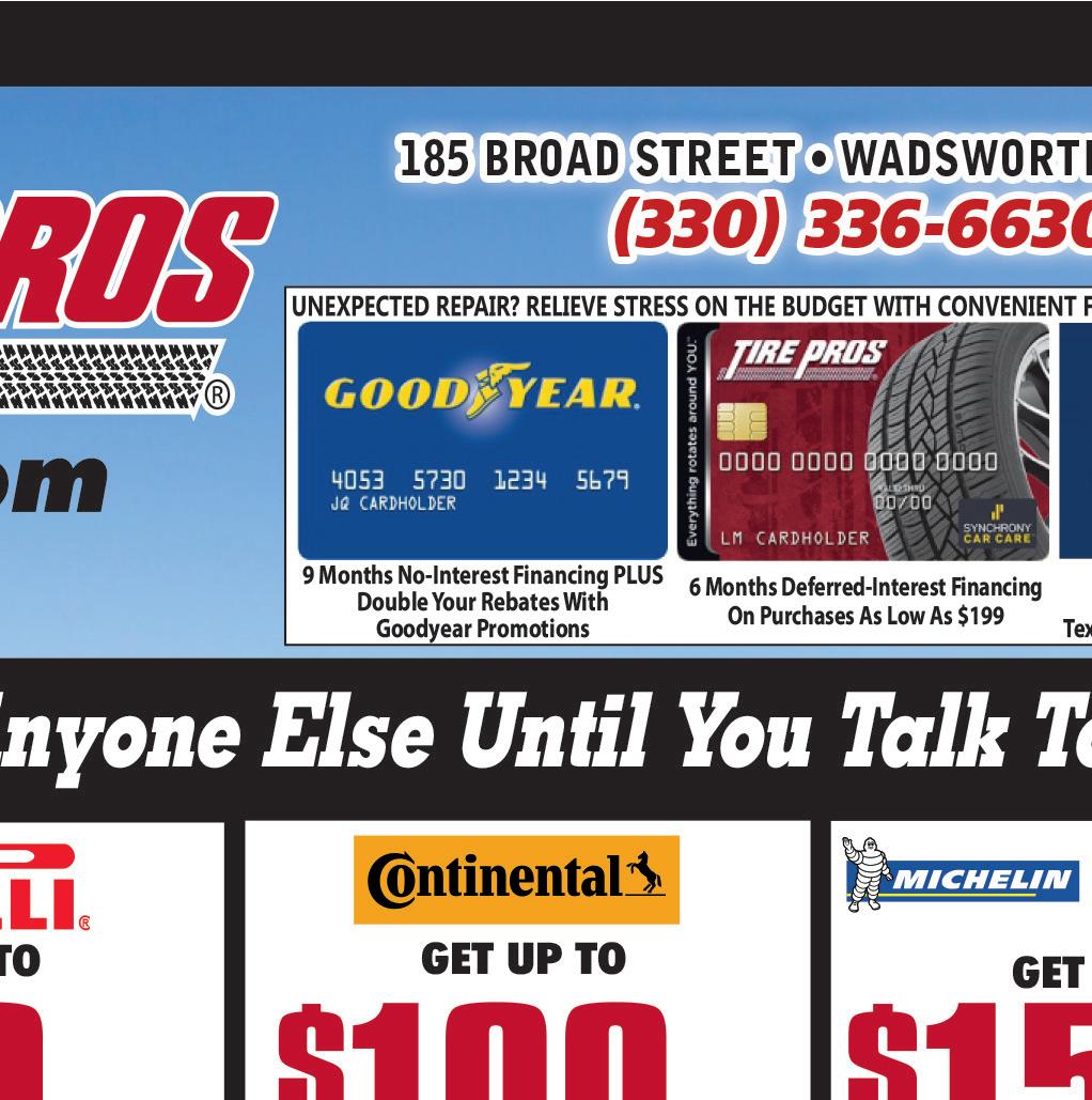 WADSWORTH July 2020 Shop locally. Save locally. DON’T BUY TIRES ANYWHERE UNTIL YOU TALK TO VAN’S 185 Broad St • Wadsworth 330-336-6630 • vanstirepros.com BEST ENGINE PROTECTION BETTER ENGINE PROTECTION GOOD ENGINE PROTECTION BRAKE SERVICE FULL SYNTHETIC with MAXLIFE TECHNOLOGY™ $4995 Regular $59.95 MAXLIFE™ SYNTHETIC BLEND Regular $44.95 Selected vehicles may vary. (Up to 6 quarts) Coupons may not be combined with any other offer Expires 7/30/20 PREMIUM CONVENTIONAL $2495 Regular $29.95 Selected vehicles may vary. (Up to 6 quarts) Coupons may not be combined with any other offer. Expires 7/30/20 Coupons may not be combined with any other offer. See store for details. Expires 7/30/20 $3495 Selected vehicles may vary. (Up to 6 quarts) Coupons may not be combined with any other offer. Expires 7/30/20 FREE TIRE ROTATION FREE TIRE ROTATION FREE TIRE ROTATION SAVE$40 OFF Extra Savings - $100 on both Axels PER AXEL Downtown Wadsworth 146 Main Street Wadsworth ALEXANDRI’S RESTAURANT “Great Food, Great Service, Unbeatable Prices” Serving Medina County 30 Years! BREAKFAST 2 Eggs, Choice of Homefries, Fruit or Grits with Toast • Bacon, Sausage or Ham $399 Valid Mon-Fri till 11am Only Valid only with coupon. Not valid with any other offer or specials. Expires 7-30-20 Valid Mon-Fri Open till 11am Only Valid only with coupon. Not valid with any other offer or specials. Expires 7-30-20 ALEXANDRI’S FAMILY RESTAURANT DINNER FOR 2 Choice of Pork Chops, Tilapia or Grilled Chicken $1795 Valid only with coupon. Not valid with any other offer or specials. Expires 7-30-20 Includes Potato, Vegetable, Soup & Salad ALEXANDRI’S FAMILY RESTAURANT Valid only with coupon. Not valid with any other offer or specials. Expires 7-30-20 ALEXANDRI’S FAMILY RESTAURANT limit 2 per table limit 2 per table BREAKFAST 2 Pancakes or 2 French Toast, Choice of Bacon, Sausage or Ham $399 ALEXANDRI’S FAMILY RESTAURANT ALEXANDRI’S FAMILY RESTAURANT Valid 11am to Close ALEXANDRI’S FAMILY RESTAURANT $5.00 OFF Any Purchase $25 or More Off regular menu price Valid All Day Valid only with coupon. Not valid with any other offer or specials. Expires 7-30-20 Valid only with coupon. Not valid with any other offer or specials. Expires 7-30-20 BURGER SPECIAL Greek Burger with Fries $749 Includes Grilled Onions, Peppers, Tomatoes, Feta Cheese & Tzatziki Sauce Valid 11am til Close DINNER FOR 2 1/2 Dozen Breaded Jumbo Shrimp $749 Valid 11am till Close (Limit 2 per coupon) Each Includes Potato or Vegetable, Soup or 1 Trip to Salad Bar Normal Hours Mon 7am-8pm Tues-Sat 6am-8pm Sun 7am-3pm Mon Tues-Sat Sun Dine In, Carry Out & Curbside Available Dine In, Out & Available