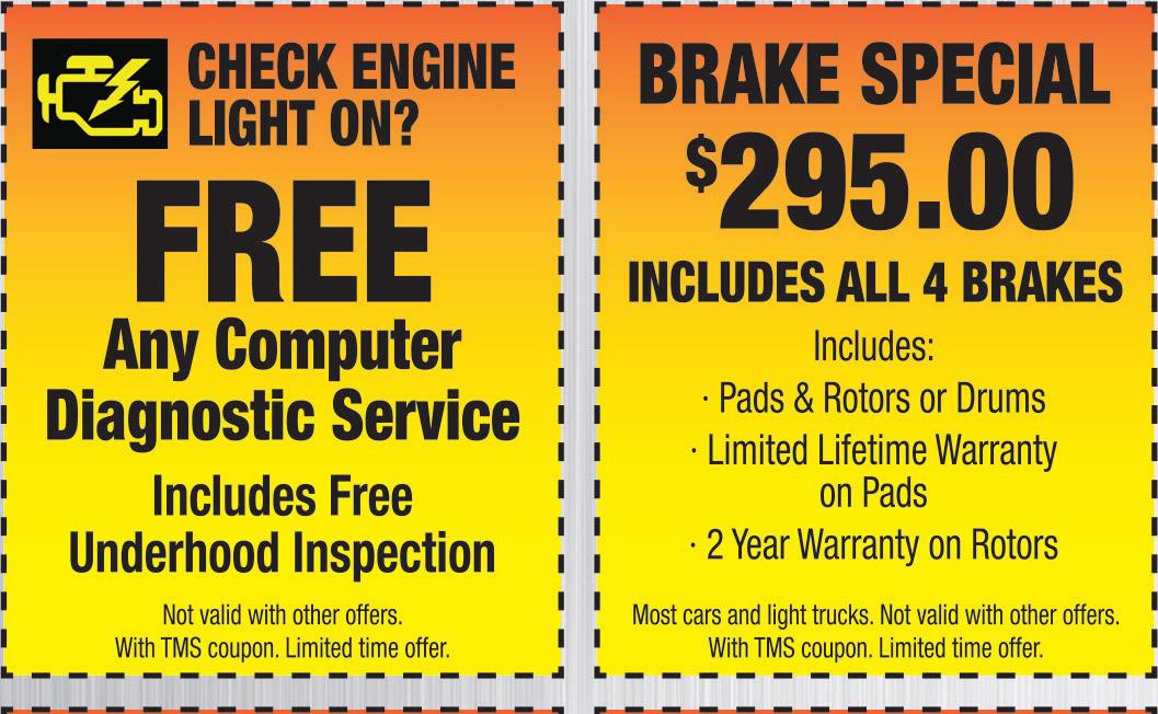 359 S R eynolds Rd Toledo Most cars and light trucks. Not valid with other offers. With TMS coupon. Limited time offer. SEMI-SYNTHETIC OIL CHANGE $29.95 $39.95 Made by Chevron Lubricants USA • Up to 5 qts. Oil & Filter Change • Rotate & inspect 4 tires • Courtsey Check including visual brake check, battery, air filter, fluid, belts & hoses FULL-SYNTHETIC OIL CHANGE Most cars and light trucks. Not valid with other offers. With TMS coupon. Limited time offer. Made by Chevron Lubricants USA • Up to 5 qts. Oil & Filter Change • Rotate & inspect 4 tires • Courtsey Check including visual brake check, battery, air filter, fluid, belts & hoses WINTER SPECIAL WE BEAT ANY PRICE GUARANTEED! • Wheel Alignments • Head Gasket & Timing • Brakes & Brake Repair • Oil Change • Tires - New & Used • Check Engine LIght • Belts & Hoses • Lights & Wipers • Car Heating & A/C • Steering & Charging • Radiator & Engine Cooling • Engine & Transmission Rebuild - Bring in your official estimateW We Don’t Make EXCUSES , We Make It HAPPEN! Most makes & models. Not valid with other offers. With TMS coupon. Limited time offer. Flush & Fill BRAKE SPECIAL Most cars and light trucks. Not valid with other offers. With TMS coupon. Limited time offer. INCLUDES ALL 4 BRAKES Includes: • Pads & Rtotos or Drums • Limited Lifetime Warranty on Pads • 2 Year Warranty on Rotors BRAKE SPECIAL LIFETIME WARRANTY Most cars and light trucks. Not valid with other offers. With TMS coupon. Limited time offer. Brake Pads all the way around Limited time offer. BALANCE TIRES $7.99 Not valid with other offers. With TMS coupon. Limited time offer. EACH $7500 INCLUDES COOLING FLUSH & THERMOSTAT $29500 $12000 GET READY FOR COLD WEATHER NEW BATTERIES $14400 3 YR. Not valid with other offers. With TMS coupon. Limited time offer. Not valid with other offers. With TMS coupon. Limited time offer. USED TIRES $39.95 INSTALLED ATOZEEMAX